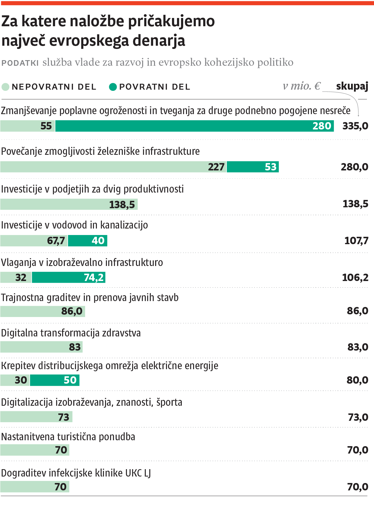 Med naložbami na področju zelenega prehoda izstopa zlasti naložba za zmanjšanje poplavne ogroženosti in tveganja za druge podnebno pogojene nesreče, kot so požari ali plazovi, ki je z več kot 300 milijoni načrtovanih evropskih sredstev naložba, za katero med vsemi naložbami pričakujemo največ evropskih sredstev. Med večjimi projekti v tem delu je tudi nadgradnja in digitalizacija železniške infrastrukture, za kar pričakujemo slabih 300 milijonov evrov evropskih sredstev. S tem denarjem naj bi nadgradili železniške postaje Ljubljana, Domžale in Grosuplje ter posodobili gorenjsko progo in primorsko progo od Ljubljane do Borovnice.