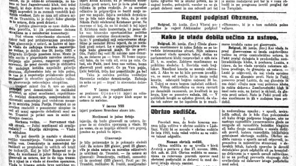 Na Vidov dan, dne 28. junija 1921, je dobila naša nova država svojo prvo ustavo. Ako odbijemo vse druge momente, moramo priznati, da je ta dan za razvoj našega notranje- in vnanje-političnega življenja zgodovinskega pomena. V ostalem pa ne pomenja sprejetje centralistično-kapitalistične ustave za jugoslovansko delavno ljudstvo nič več in nič manj, nego poostritev ustavne borbe, ki se bo nadaljevala toliko časa, dokler ne zahrešči trhla stavba nadutega centralizma in brezobzirnega kapitalizma na tla. Ni daleč čas, ko se izkaže, da je edinole avtonomija, za katero se bori Jugoslovanski klub, tisti trdni temelj, ki daje državi vsa jamstva za najboljši napredek in za razmah vseobčih kulturnih vrednot. Zato se nam zdi zdrava misel dr. Trumbiča, ki je dejal: Kdor glasuje za to ustavo, dela proti državi.« (…)