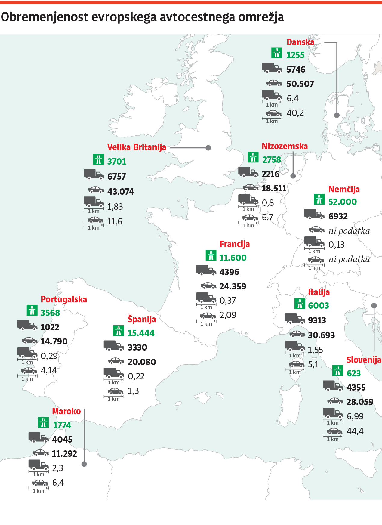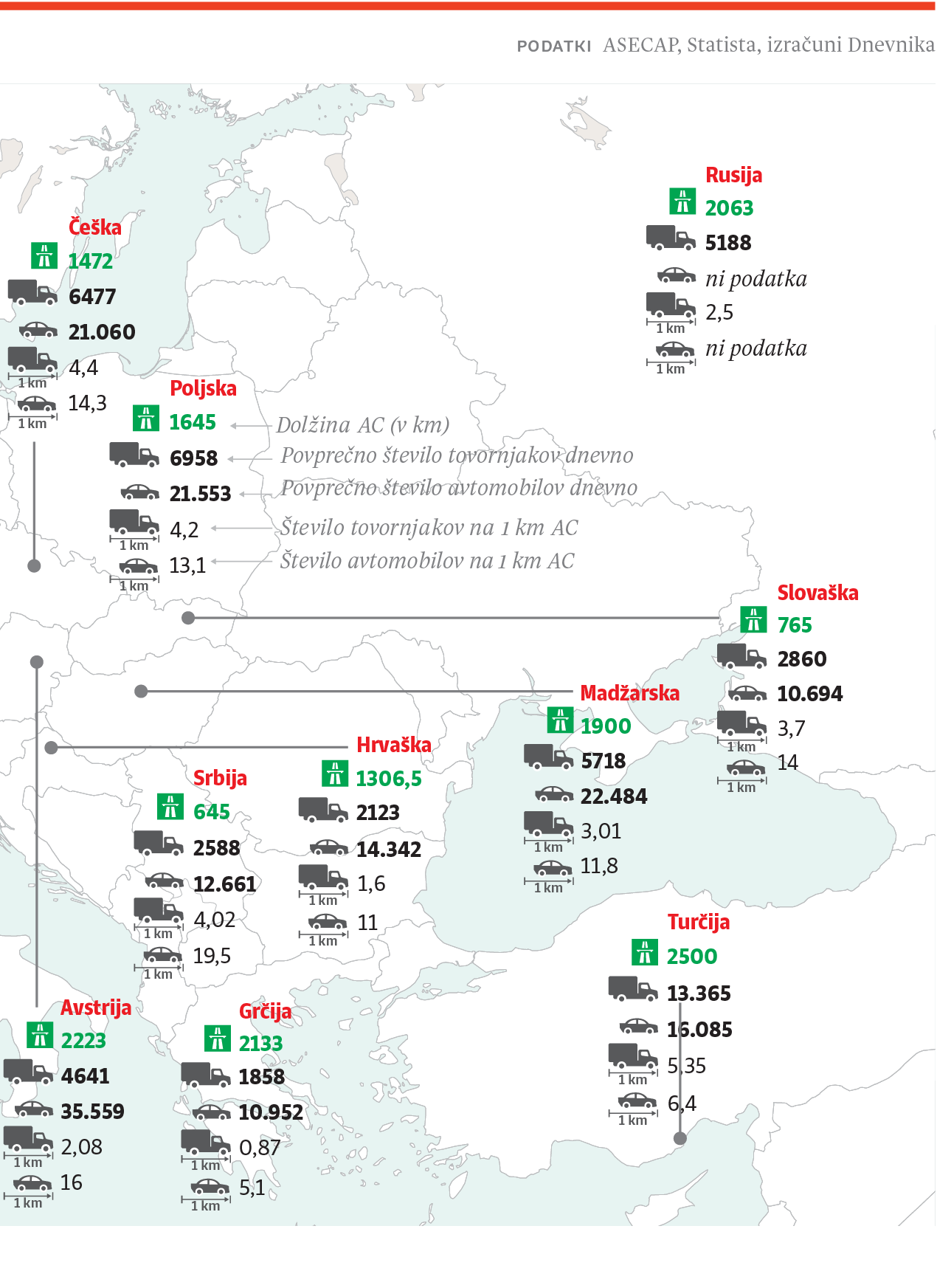 Podatki članic evropskega združenja avtocestnih koncesionarjev (Asecap) o prometu osebnih in tovornih vozil na evropskem avtocestnem omrežju medtem kažejo, da je stanje v Sloveniji relativno alarmantno, če gostoto prometa primerjamo z drugimi evropskimi državami. V Sloveniji tako po izračunih Dnevnika na vsakem kilometru avtoceste vozi sedem tovornjakov in več kot 44 avtomobilov.