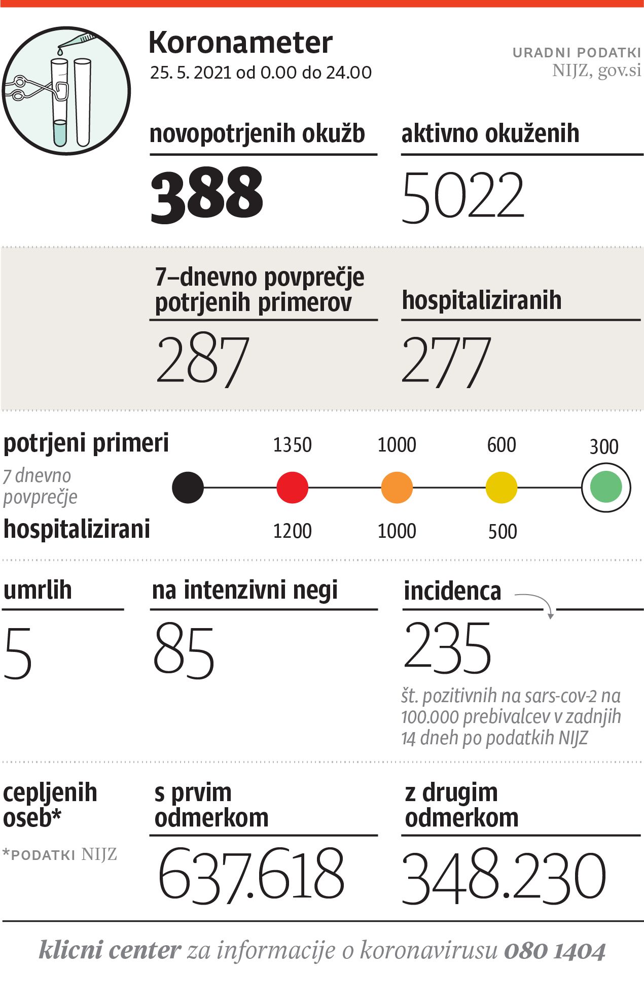 Sedemdnevno povprečje je po podatkih Nacionalnega inštituta za javno zdravje (NIJZ) padlo na 287 okužb na dan, prehod v zeleno fazo pa je predviden ob padcu pod 300 okužb dnevno. Do zaključka redakcije odločitve vlade o protikoronskih ukrepih še niso bile znane, a večjih sprememb ni pričakovati.