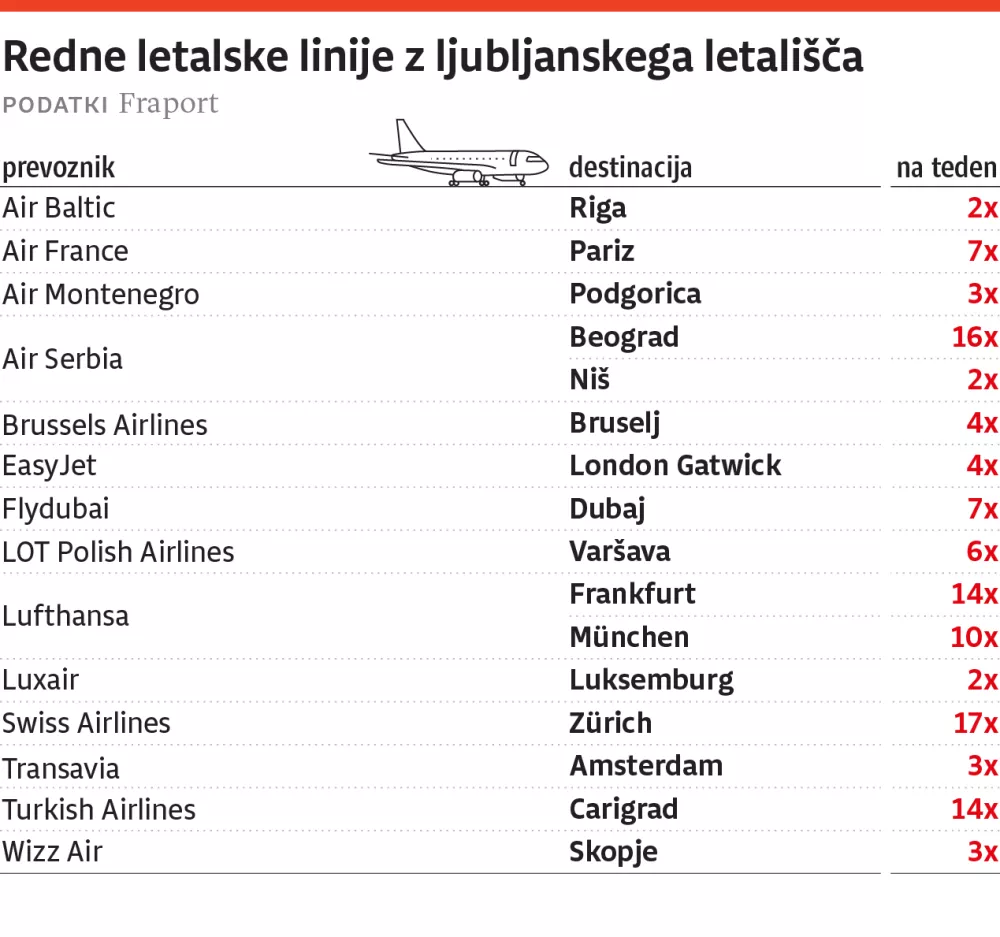 Na našem največjem mednarodnem letališču sicer trenutno velja zimski vozni red, skupaj pa je potnikom na voljo 16 rednih letalskih povezav s 14 prevozniki, in sicer s spodnjimi frekvencami letov: