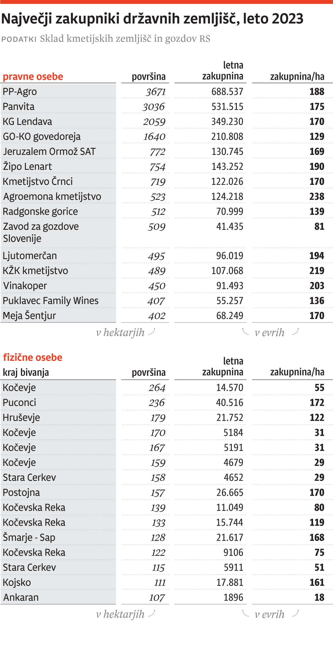 Progresivni dvig zakupnine za državna zemljišča bi prizadel štirideset zakupnikov, od tega petindvajset kmetijskih podjetij in petnajst družinskih kmetij. Toliko jih ima po podatkih sklada trenutno v zakupu več kot sto hektarjev državnih kmetijskih zemljišč. S 3671 hektarji je med podjetji rekorderka Perutnina Ptuj Agro, ki je v ukrajinski lasti. Kot je razvidno iz priložene grafike, ima več kot sto hektarjev državnih zemljišč v zakupu tudi petnajst fizičnih oseb, največ na Kočevskem, kjer imajo poleg pašnikov in travnikov v zakupu tudi precej zemljišč v zaraščanju ali zemljišč, poraslih z gozdom. Posledično skladu plačujejo občutno nižje zakupnine kot denimo v Prekmurju, kjer rekorder, kmet Goran Škaper iz okolice Puconcev, plačuje 172 evrov na hektar, največji zakupnik med fizičnimi osebami (iz skladove spletne evidence zakupnih razmerij je mogoče razbrati, da je to Gregor Gomol iz okolice Kočevja) pa 55 evrov na hektar.