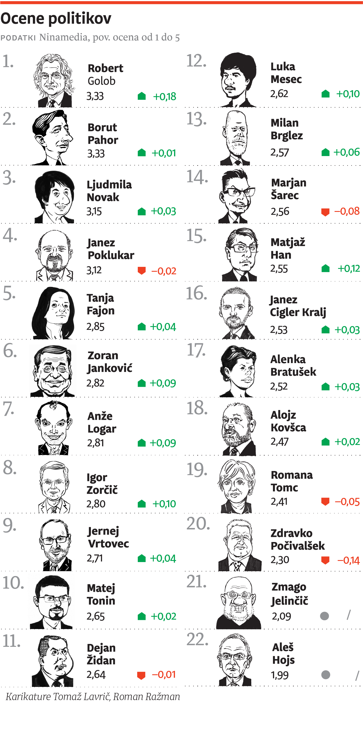 Razplet aprilskih volitev je povzročil tudi nekaj pomembnih sprememb na lestvici priljubljenosti slovenskih politikov. Glede na zadnjo meritev, ki je bila opravljena pred 24. aprilom, je le pet politikov ocenjenih slabše, petnajst pa boljše. Prva posledica sprememb je, da je bodoči mandatar Robert Golob na vrhu ujel predsednika republike Borut Pahor in imata enako oceno – sicer pa sta bila oba ocenjena boljše, kot aprila. Na tretjem mestu je evropska poslanka Ljudmila Novak, ki je na tem mestu zamenjala ministra za zdravje Janeza Poklukarja, medtem ko so predsednica SD Tanja Fajon, ljubljanski župan Zoran Janković, zunanji minister Anže Logar, nekdanji predsednik DZ Igor Zorčič in poslanec NSi Jernej Vrtovec obdržali svoje pozicije. Predsednik NSi Matej Tonin je pridobil eno mesto in je pred enajsto uvrščenim nekdanjim poslancem Dejanom Židanom, ki zaključuje zgornji del razpredelnice. V spodnjem delu razpredelnice smo zabeležili nekaj premikov – predsednik LMŠ Marjan Šarec in poslanec NSi Janez Cigler Kralj sta padla za tri mesta, poslanec SD Matjaž Han je pridobil štiri mesta in je petnajsti. Evropska poslanka Romana Tomc je padla za dve mesti, koordinator Levice Luka Mesec in predsednik državnega sveta Alojz Kovšca pa sta napredovala za eno mesto. Novo uvrščena predsednik SNS Zmago Jelinčič in nekdanji notranji minister Alojz Hojs sta končala na dnu razpredelnice in zapuščata družbo najbolj priljubljenih politikov. Naslednji mesec ju bosta zamenjala predsednik SDS Janez Janša in novi evropski poslanec Matjaž Nemec, ki so ju anketiranci največkrat predlagali.