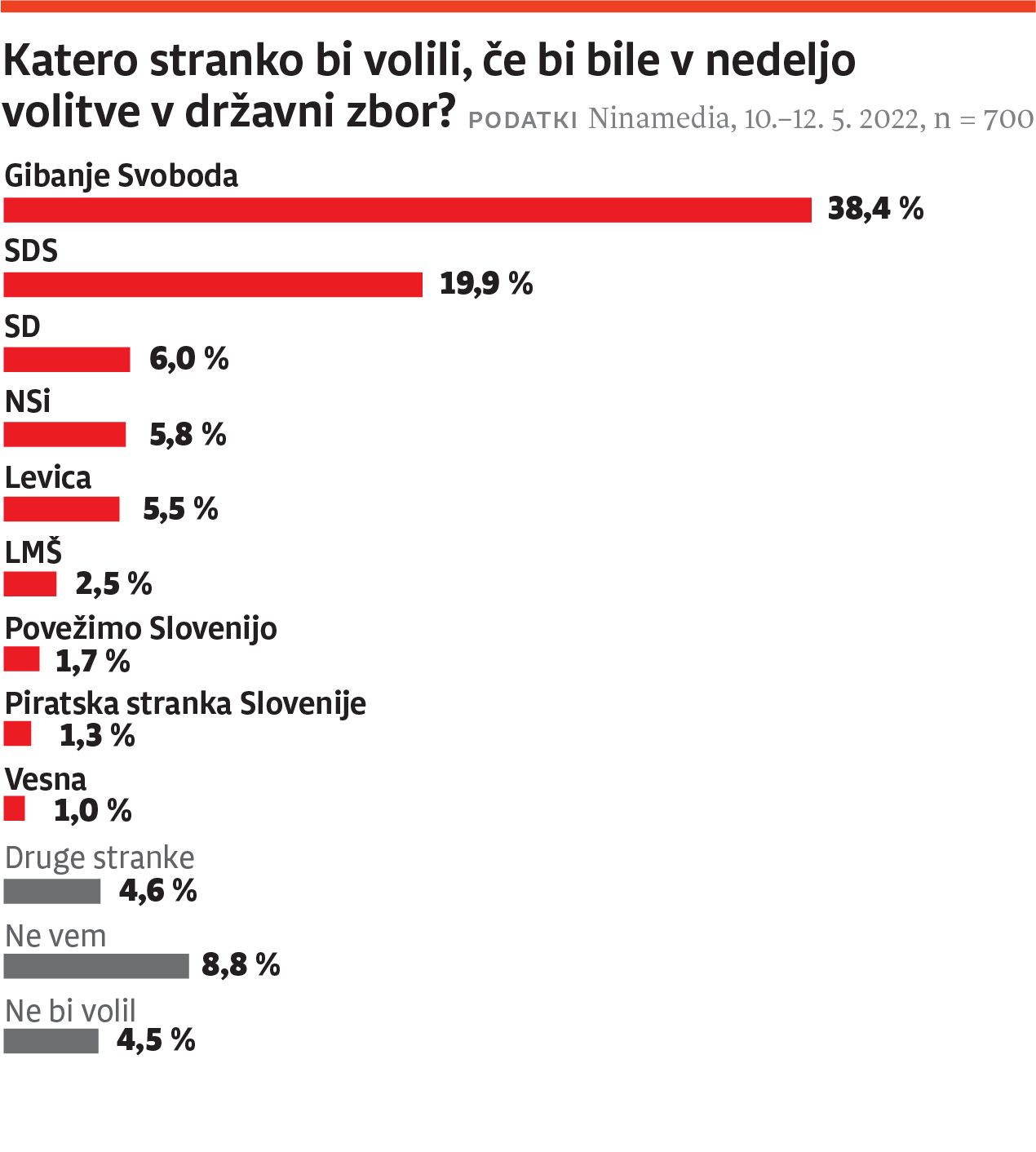 Nekaj podobnega lahko spremljamo tudi v primeru stranke Gibanje Svoboda, ki jo je pred slabim mesecem podprlo dobrih 34 odstotkov volilcev, v anketi Vox populi pa seže celo do 38,4-odstotne podpore. Če bi takšno podporo preračunali v poslanske mandate, bi imela Svoboda v državnem zboru kar 45 poslanskih sedežev, to pa bi ji praktično omogočilo samostojno vladavino. Gibanje Svoboda ima pred zasledovalno stranko SDS (19,9 odstotka) skoraj podvojeno prednost, zato ne moremo govoriti o tem, da slovenski demokrati sledijo Svobodi, ampak je vsaka stranka kategorija zase. Zmagovalka volitev je v položaju, v kakršnem v Sloveniji že dolgo ni bila kakšna politična stranka, za njo pa je nekje na sredini lestvice (prav tako osamljena) prva opozicijska stranka.