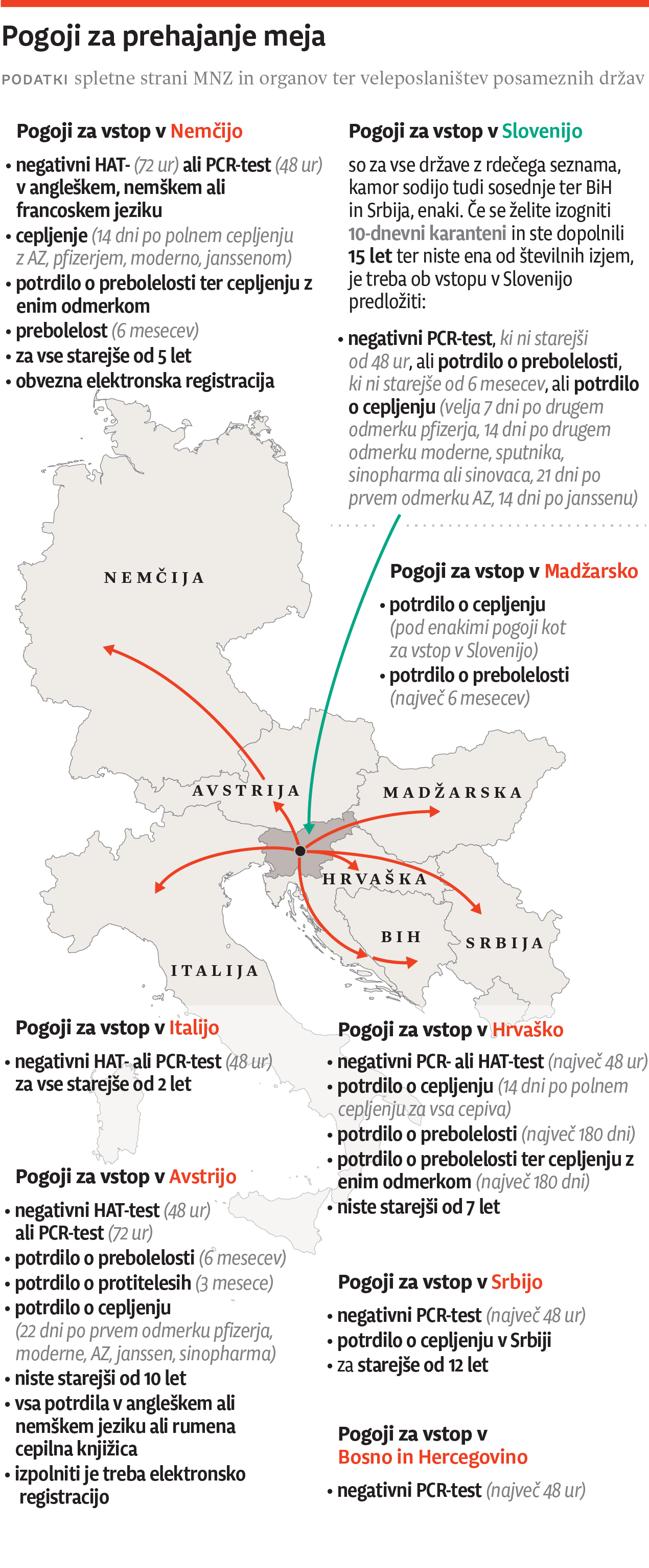 V Italijo in BiH je možen vstop izključno s predloženim negativnim testom, status prebolevnika ali cepljenega ni pomemben. V Srbiji priznavajo samo cepljenja v njihovi državi, drugi se morajo testirati z metodo PCR pred prečkanjem meje.