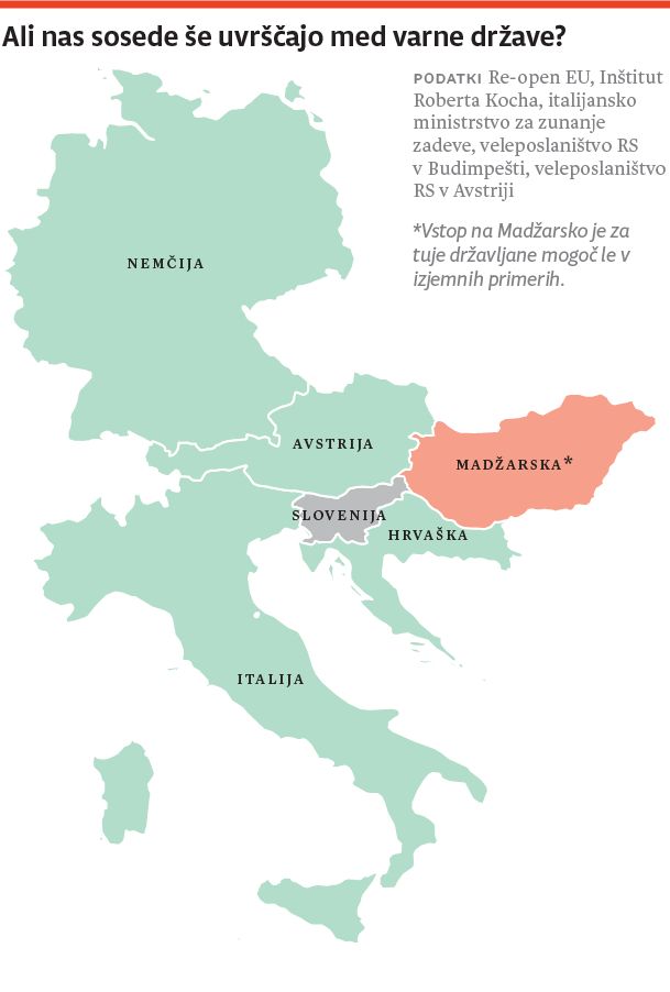 Slovenija še naprej ostaja tudi na avstrijskem seznamu varnih držav. Osebe, ki imajo prijavljeno prebivališče v Sloveniji, lahko v Avstrijo vstopajo brez predložitve testa na covid-19, vendar pa morajo verodostojno izkazati, da se v zadnjih desetih dneh niso mudile v državi, ki ni na njihovem seznamu varnih držav. Madžarska je medtem z minulim tednom bolj ali manj zaprla svoje zunanje meje – tudi za prebivalce Slovenije. V nadaljevanju je sprejela več izjem, med drugim za poslovne obiske, udeležbo na koncertih in športnih prireditvah, za športnike, tranzit in dnevne migrante.