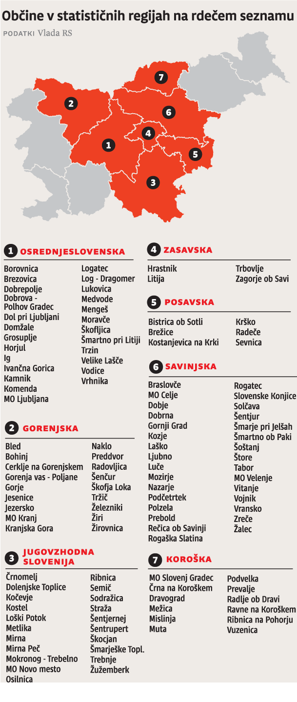 Prebivalcem rdečih statističnih regij bo od polnoči prepovedan prehod v druge regije. Seznam rdečih regij temelji na podatkih o številu okuženih na 100.000 prebivalcev v zadnjih 14 dneh. Sedem regij, kjer je to število v torek presegalo 140, je vlada uvrstila med rdeče. To so: osrednjeslovenska, gorenjska, jugovzhodna Slovenija, savinjska, koroška, zasavska in posavska regija. A seznam se lahko že kaj kmalu spremeni, saj naj bi NIJZ na svoji spletni strani in v Uradnem listu po novem vsaj enkrat na teden objavljal podatke o epidemiološki situaciji po regijah.