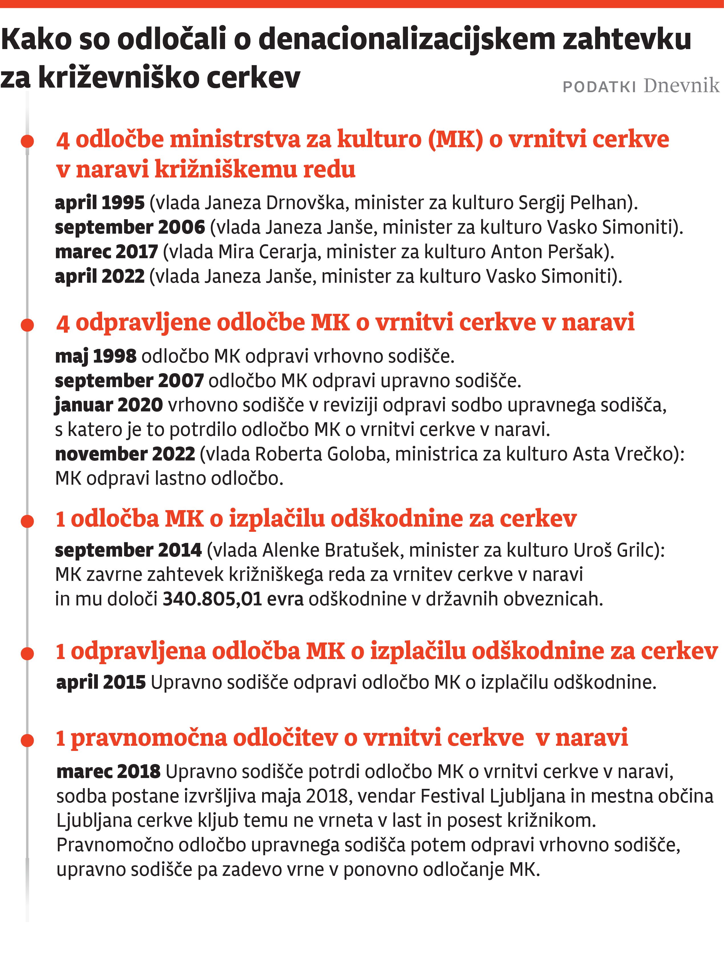 »Pozivamo vse deležnike, tudi bodočo sestavo ministrstva za kulturo, da razmislijo o uporabi vseh morebitnih izrednih pravnih sredstev, ki jih je mogoče uporabiti v zvezi z očitno napačno odločitvijo ministra za kulturo.« S tem pozivom se je Festival Ljubljana kot upravljalec Križank 11. maja lani v izjavi za Dnevnik odzval na odločbo ministrstva za kulturo, s katero je to slab mesec prej, 19. aprila, križevniško cerkev že četrtič vrnilo v last in posest križniškemu redu. »Festival Ljubljana je v denacionalizacijskem postopku vseskozi zatrjeval, in to tudi podkrepil s strokovnimi ekspertizami, da bo vrnitev križevniške cerkve denacionalizacijskemu upravičencu v naravi okrnila prostorsko kompleksnost Križank kot enega najbolj prepoznavnih kulturnih središč pri nas in v centralni Evropi nasploh,« je svoje nestrinjanje takrat za Dnevnik utemeljil Festival Ljubljana.