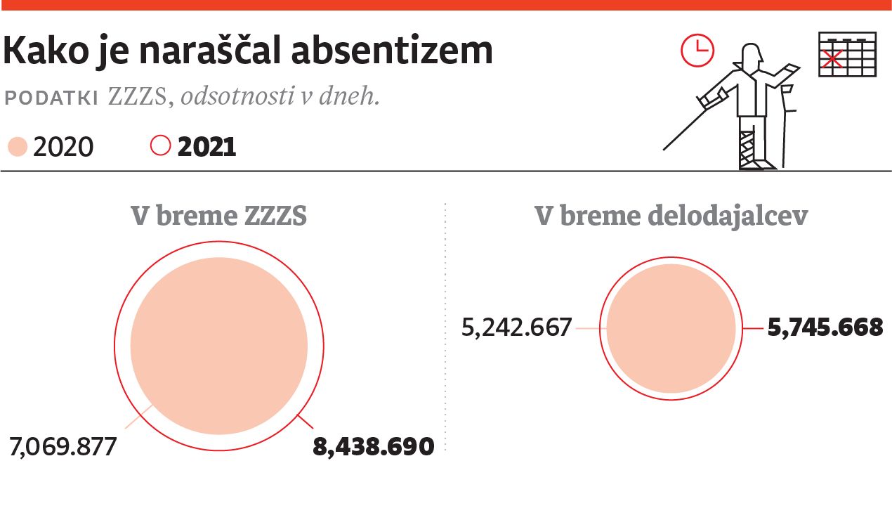 Že pandemija je, ko gre za dneve odsotnosti, zdravstveni blagajni prinesla večje dodatne obremenitve. Odsotnosti v breme ZZZS, ki med drugim zajemajo tudi nego svojcev in izolacijo zaradi covida-19, so lani v primerjavi z letom 2020 zrasle za 19, odsotnosti v breme delodajalcev pa za malo manj kot deset odstotkov.