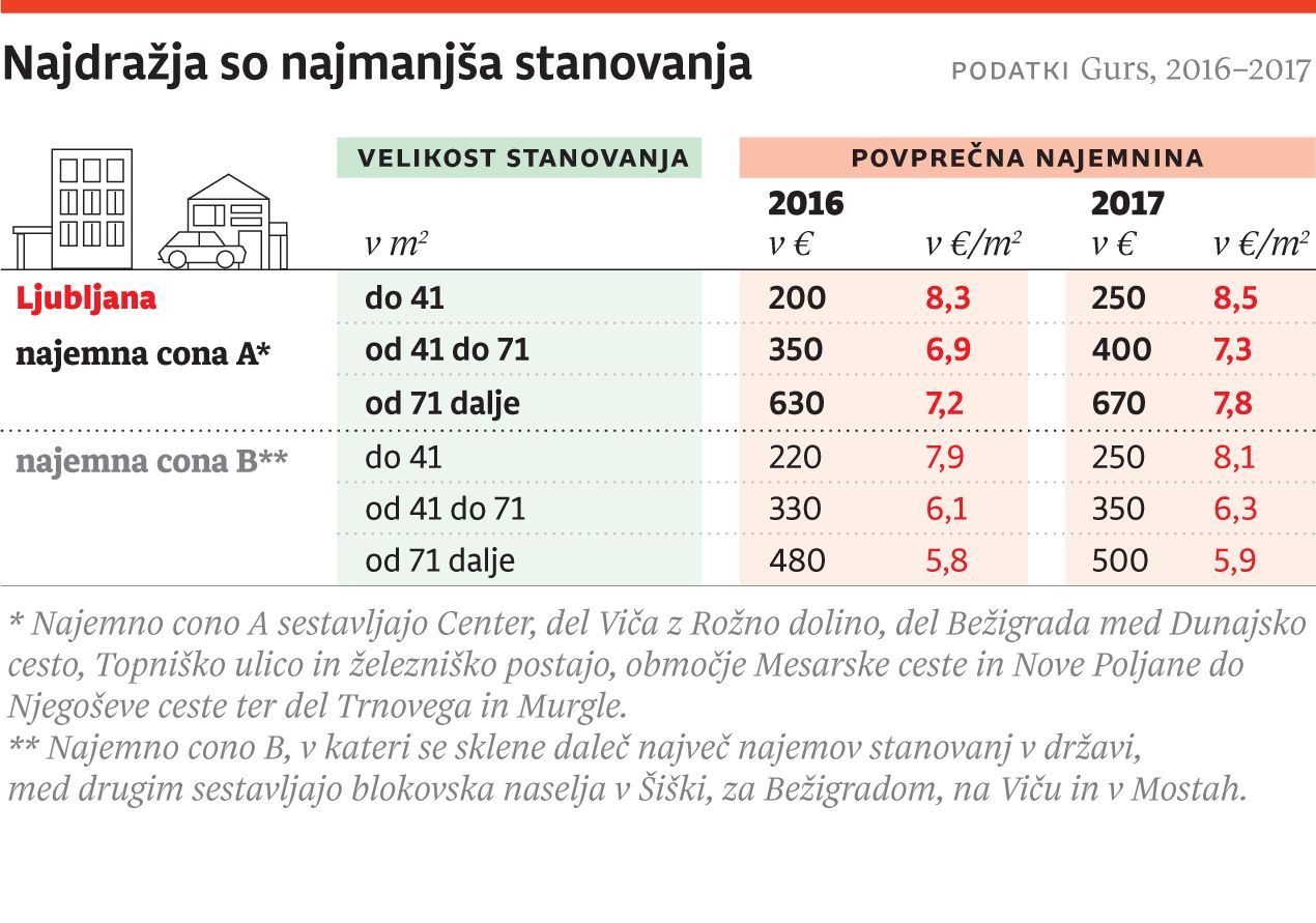 Na enem največjih nepremičninskih portalov pri nas lastniki in agencije trenutno v najem v Ljubljani ponujajo okoli 400 stanovanj. V bližnji okolici jih je na voljo še 60. Po zadnjih podatkih geodetske uprave se samo v glavnem mestu sicer na leto oddaja okoli 95.000 stanovanj. V nasprotju s stanovanji za prodajo po besedah direktorja nepremičninske agencije Stoja Zorana Ðukića najemniških stanovanj v Ljubljani in okolici ne primanjkuje. Izjema je strogo središče glavnega mesta, kjer denimo dvosobnega stanovanja ni tako lahko najeti tudi zaradi donosnejšega oddajanja tovrstnih manjših enot turistom prek spletnega portala Airbnb. »Ker se je država lotila regulacije in iskanja tistih, ki nepremičnine oddajajo na črno, se je stanje v zadnjem času nekoliko popravilo, a manjša stanovanja v centru so še vedno namenjena predvsem kratkoročnemu najemu,« pripoveduje Ðukić.