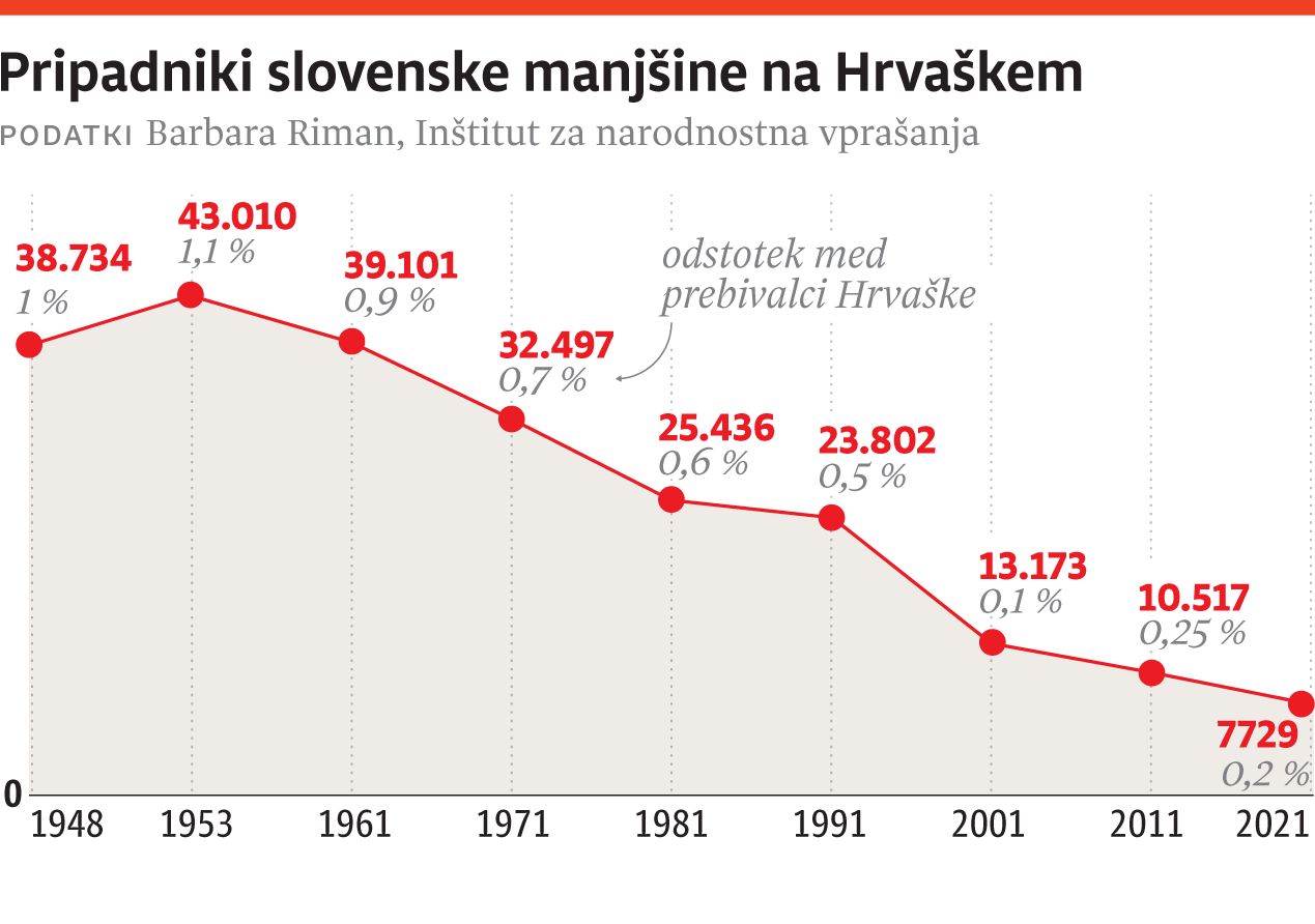 Število pripadnikov slovenske manjšine na Hrvaškem se je v zadnjem obdobju izrazito zmanjšalo. Podatki iz leta 2021 kažejo, da pri južnih sosedih uradno živi 7729 Slovencev, ki se opredeljujejo za pripadnike manjšine. Deset let prej jih je bilo 10.517, leta 2001 nekaj več kot 13.000. V zgodovini je bilo Slovencev na Hrvaškem sicer mnogo več – največ ob popisu leta 1953, ko so jih raziskovalci našteli 43.010. Tedaj so Slovenci dosegli tudi največji delež v hrvaškem prebivalstvu – 1,1 odstotka. Leta 2021 jih je bilo le še za dve desetini odstotka.