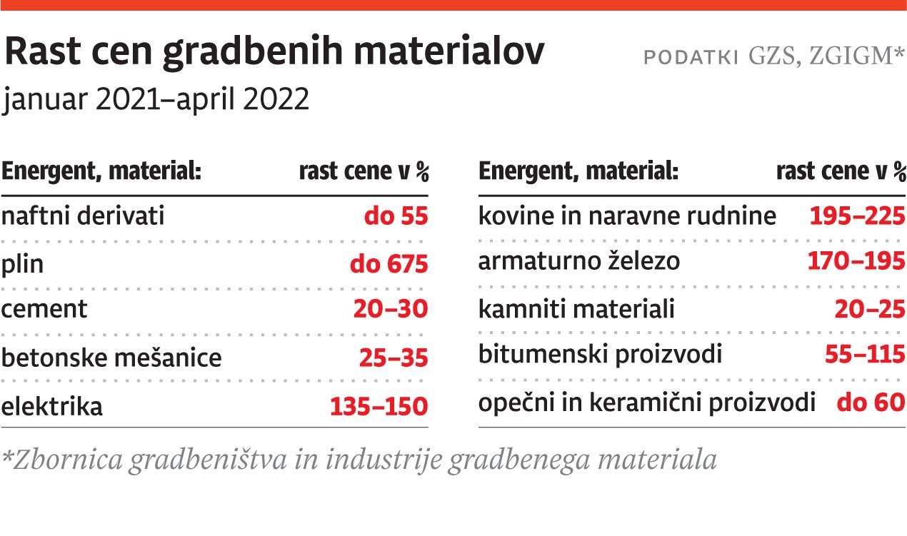 Po podatkih zbornice gradbeništva in industrije gradbenega materiala pri GZS tožbe o podražitvah tokrat niso iz trte izvite; tako materiali kot storitve so se od lanskega januarja do konca letošnjega aprila drastično podražili (podatki so v tabelah). Že drugo leto zapored opažajo izrazito rast cen denimo armaturnega železa, cementnih, opečnih, bitumenskih in polimernih izdelkov, vodovodnih in kanalizacijskih cevi ter seveda zemeljskega plina in nafte. »Vzroki podražitev so v skoraj triletni zdravstveni krizi in trenutnem zunanjepolitičnem položaju v Ukrajini in so vezani na globalno, ne samo na lokalno okolje. Ta dva dogodka sta povzročitelja inflacije. Hkrati se je pojavilo izrazito pomanjkanje omenjenih surovin tako na slovenskem trgu kot na trgih EU,« je pojasnil Gregor Ficko, direktor zbornice gradbeništva in industrije gradbenega materiala pri GZS.