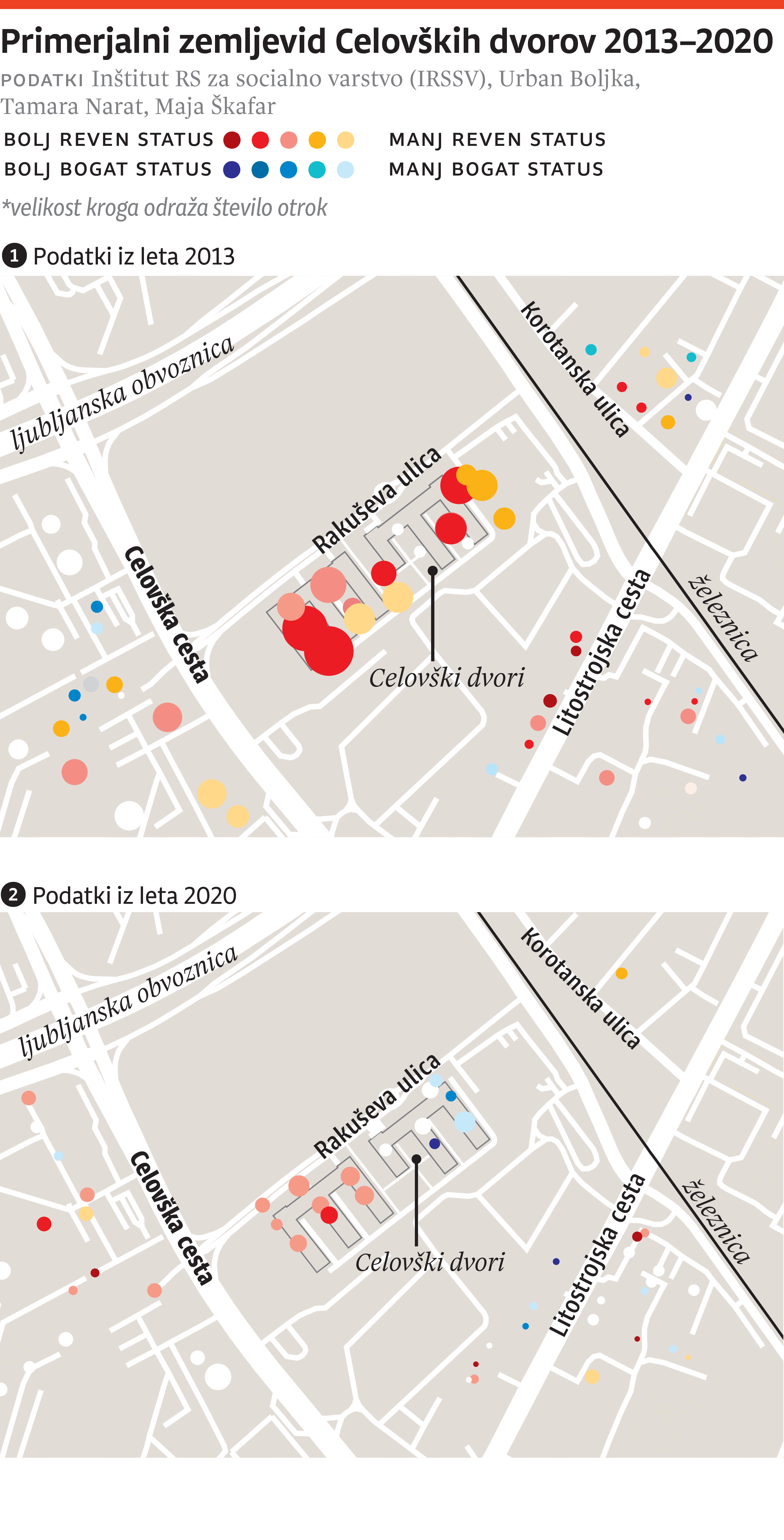 Preverili so, ali se status sosesk sčasoma spreminja. »Celovški dvori izstopajo po največjem dvigu povprečnega deleža plačila za vrtec – za 7,6 odstotne točke,« so ugotovili za obdobje od 2013 do 2020. Poenostavljeno rečeno: Celovški dvori so svoj premoženjski status sčasoma malenkost popravili navzgor. »Povprečno plačilo se je med letoma 2013 in 2020 zvišalo še na Novih Poljanah, v Stari Ljubljani, na Fužinah in v Polju,« so ugotovili. Kljub temu pa Polje ostaja soseska z največ »revnimi« na enega bogatega. V letu 2020 pa se je ta delež še povečal, so ugotovili.