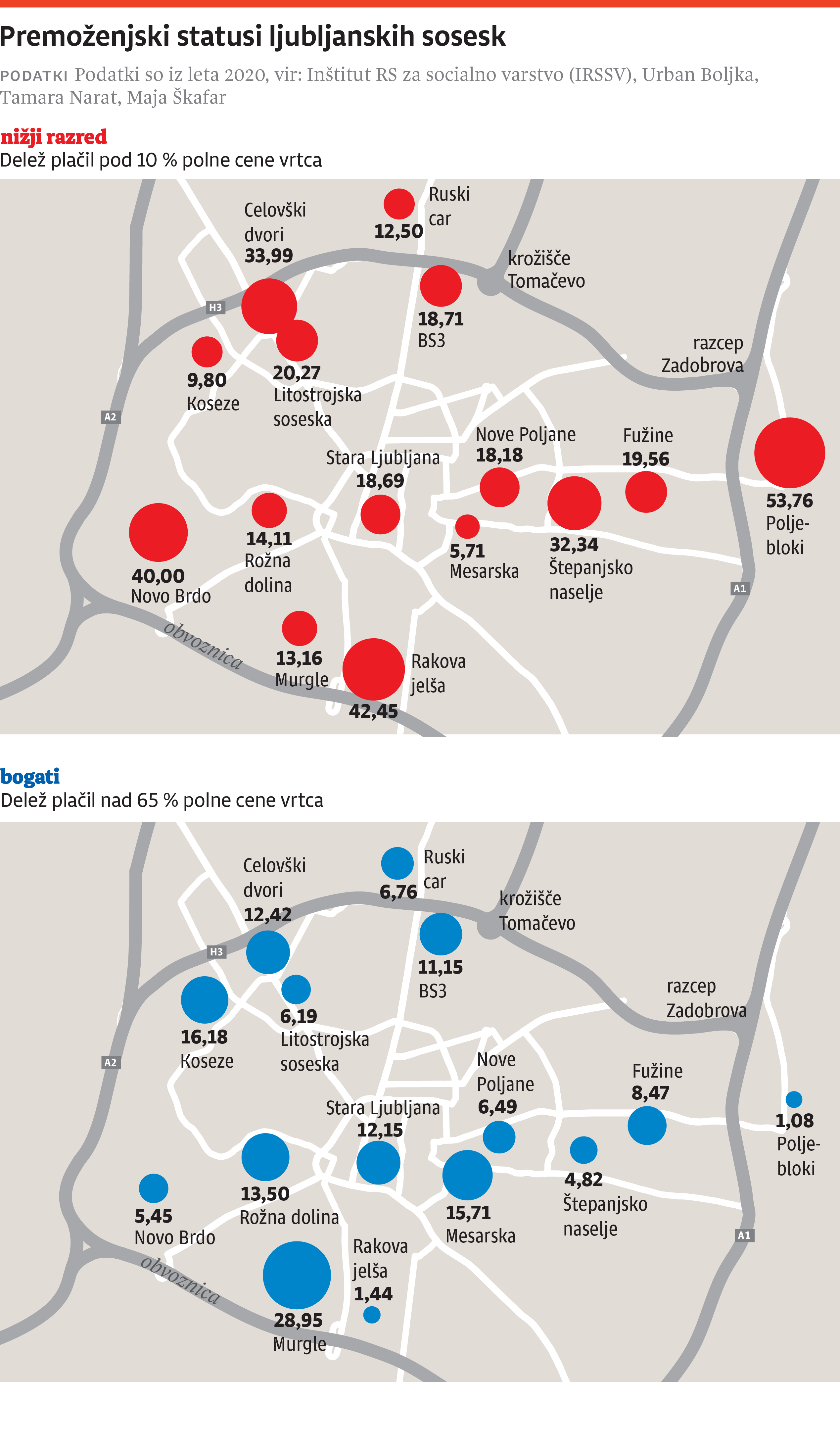 Podatke so pregledali do hišnih številk natančno in iz rezultatov sklepali na bogastvo in revščino v posameznih soseskah. »Najvišji delež cene vrtca plačujejo starši predšolskih otrok v Murglah. Ti v povprečju plačujejo dvakrat več (40 odstotkov polne cene) kot na Rakovi jelši ali Novem Brdu (20 odstotkov) oziroma skoraj dvakrat več kot v Štepanjskem naselju (24 odstotkov). Med elitnejše soseske spadata še Mesarska (36 odstotkov) in Koseze (35 odstotkov),« so navedli avtorji raziskave.
