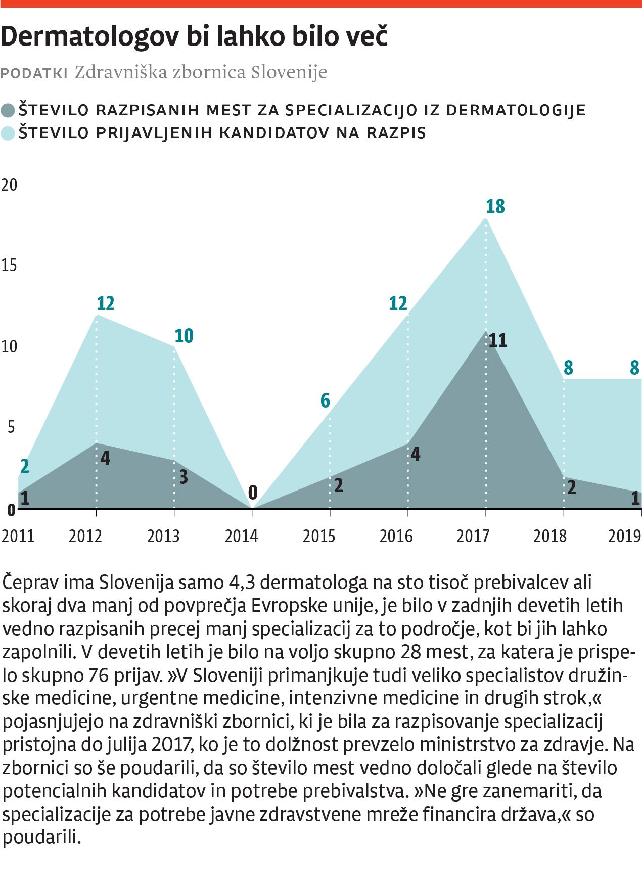 Trenutno je v Sloveniji 79 dermatologov, še 21 pa jih opravlja specializacijo. Glede na število prebivalcev je pri nas zdravnikov s tega področja malo v primerjavi z drugimi evropskimi državami, saj so po tem podatku za nami samo Irska, Norveška, Poljska in Španija, so sporočili z Nacionalnega inštituta za javno zdravje. V Sloveniji je treba na prve dermatološke preglede čakati povprečno 76 dni, s čimer je dermatologija na prvem mestu med vsemi specializacijami, in to s precejšnjo prednostjo. Čakalna doba za pregled ob odvajanju odvisnosti od alkohola, ki je na drugem mestu te neslavne lestvice, je namreč namreč za dva tedna krajša. Dermatologov bi sicer v Sloveniji lahko imeli več, kot jih imamo, saj se na razpise za specializacije prijavlja več kandidatov, kot je prostih mest, vendar ni mogoče ugoditi vsem, ki bi želeli postati dermatologi, saj je tudi drugih zdravnikov premalo, so pojasnili na zdravniški zbornici, ki je za razpise skrbela do leta 2017.