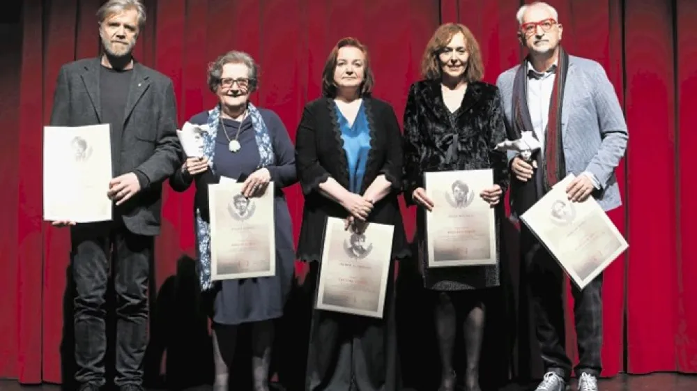 V dveh tednih bo tam na ogled 15 predstav, ki so nastale po domačih dramskih besedilih, na koncu pa bo žirija med sedmimi tekmovalnimi izbrala najboljšo in ji podelila Grumovo nagrado. Že na današnji otvoritvi je Združenje dramskih umetnikov Slovenije (ZDUS) podelilo tudi tradicionalne nagrade, ki so jih letos poimenovali po velikih umetniških osebnostih iz zgodovine slovenskega gledališča: nagrado Marije Vera za življenjsko delo je prejel igralec SSG Trst Vladimir Jurc (na fotografiji desno), nagrado Poldeta Bibiča za življenjsko delo kostumografka Marija Vidau (druga z leve); dve igralski nagradi, poimenovani po Duši Počkaj, sta prejela Mirjam Korbar in Branko Završan (levo), nagrado Marka Slodnjaka pa lektorica Tatjana Stanič (v sredini). Danes je bilo praznično tudi v drugih slovenskih gledališčih: ob svetovnem dnevu gledališča so prebrali mednarodno poslanico kubanskega dramatika in režiserja Carlosa Celdrana pa tudi slovensko različico, ki jo je pripravila igralka Maruša Majer.