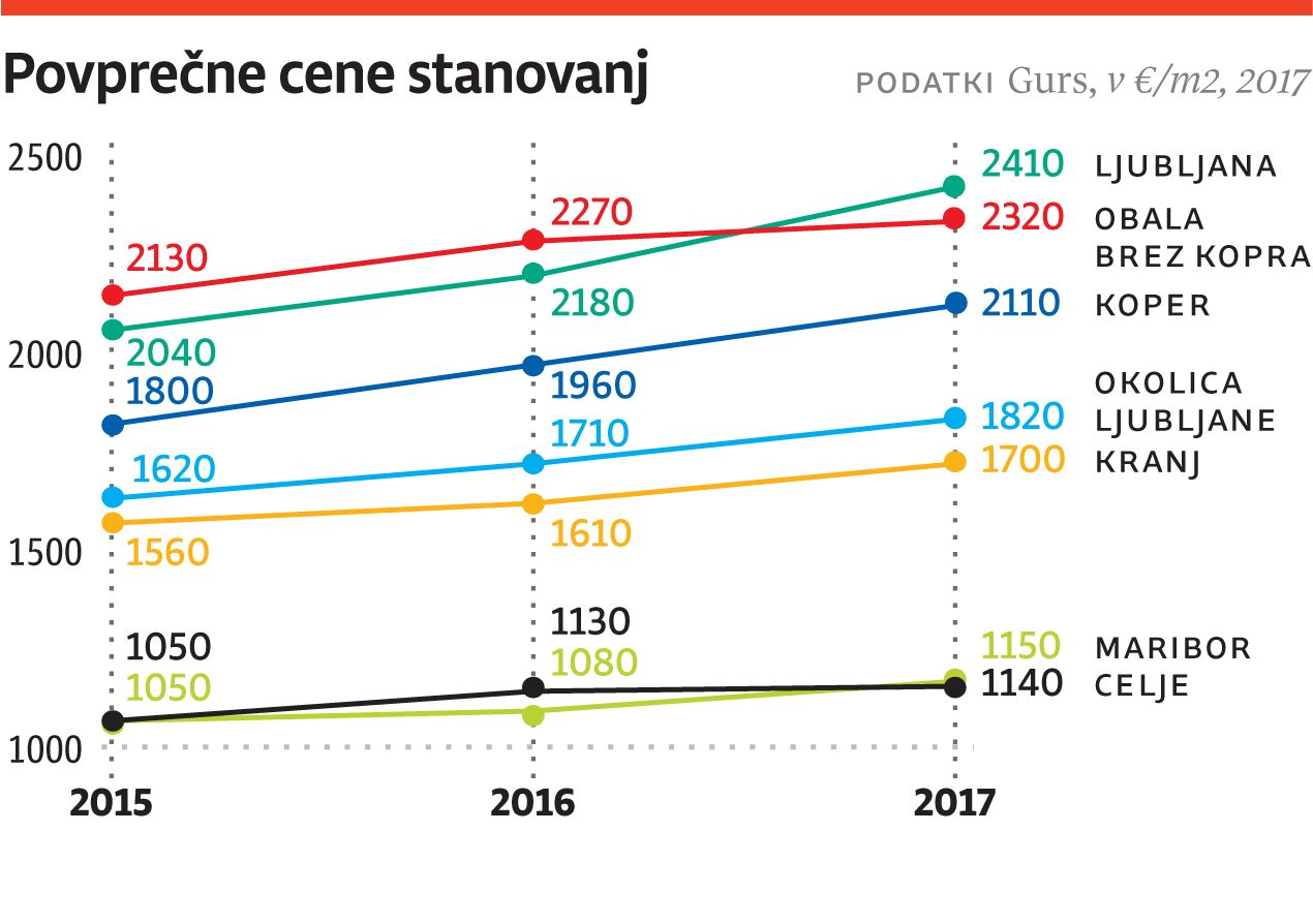 Cene stanovanj so najbolj poskočile v Ljubljani (za 18 odstotkov), sledijo Koper (17 odstotkov), okolica Ljubljane (12) in Novo mesto (11). Okoli devetodstotno povišanje cen je Gurs zabeležil v Kranju, Mariboru in Celju. Število prodaj stanovanj pa je v zadnjih treh letih najbolj zraslo v Novem mestu, Krškem in Brežicah (za 40 odstotkov), sledita okolica Ljubljane in Celja s 35 odstotki ter Ljubljana in Maribor z 20 odstotki. V Kranju, Murski Soboti in Sežani je bila rast števila prodaj okoli 10-odstotna.