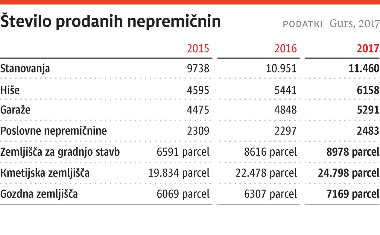 Število prodanih nepremičnin se je lani povzpelo na rekordnih 36.000 (s 34.000 leta 2016), vrednost sklenjenih pogodb pa se je tako zaradi številčnejših poslov kot zaradi naraščajočih cen stanovanjskih nepremičnin izenačila z rekordno vrednostjo leta 2007, to je 2,3 milijarde evrov. Število sklenjenih kupčij je bilo lani najvišje v zgodovini spremljanja trga nepremičnin (od leta 2007) pri vseh vrstah nepremičnin z izjemo zemljišč za gradnjo, v pravkar izdanem poročilu o nepremičninskem trgu za lansko leto ugotavlja geodetska uprava (Gurs).