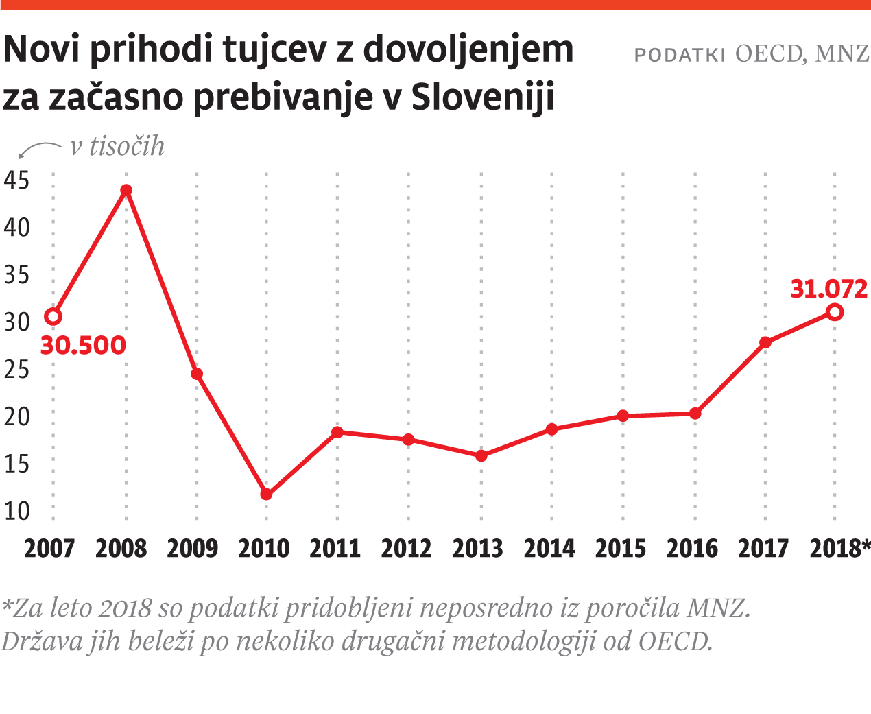 Položaj Slovenije, ki je prav tako članica OECD, je pri tem nekoliko drugačen. Priseljevanje tujcev se je v zadnjih dveh letih skokovito povečalo; od leta 2013 se je kar podvojilo. Gospodarska rast je povezana z veliko potrebo po delavcih iz tujine. »Leta 2017 je v Slovenijo prišlo 11.000 novih migrantov (mednje niso všteti državljani EU, op. p.), ki so pridobili dovoljenje za prebivanje z veljavnostjo več kot dvanajst mesecev. To je 55 odstotkov več kot leta 2016. Med njimi je bilo 61 odstotkov delovnih migrantov, 36 odstotkov članov družin, ki so se pridružile prvotnim migrantom, en odstotek dijakov in študentov ter dva odstotka drugih,« je zapisano v migracijskem poročilu. Po podatkih OECD je bilo v Sloveniji več migrantov le leta 2008, na vrhuncu tedanje konjunkture, tik pred zlomom gospodarstva. Tedaj je dovoljenje za prebivanje v enem letu pridobilo kar 43.800 tujcev.