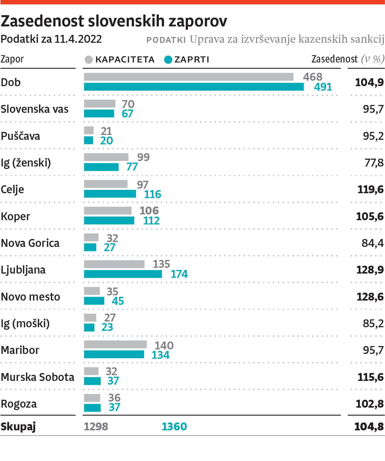 Da so slovenski zapori še vedno polno zasedeni oziroma marsikje celo bistveno prezasedeni, pojasnjujejo tudi na upravi za izvrševanje kazenskih sankcij, temu pa pritrjujejo zadnji aktualni podatki. V ponedeljek je bilo v slovenskih zaporih (brez prevzgojnih zavodov) zaprtih 1360 oseb, kar pomeni, da je bila zasedenost malenkost pod 105 odstotki. Prav tako so še vedno prezasedeni skoraj vsi največji zapori. Ljubljanski, kjer na sojenje čakajo številni priporniki, je zaseden skoraj 130-odstotno, prezaseden (105 odstotkov zapolnjenih kapacitet) pa ostaja tudi največji slovenski zapor na Dobu. Nekoliko bolje je le v njegovih odprtih oddelkih v Slovenski vasi in Puščavi.