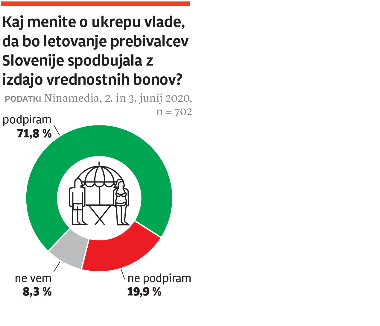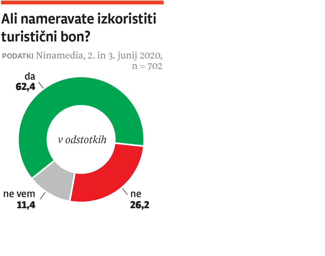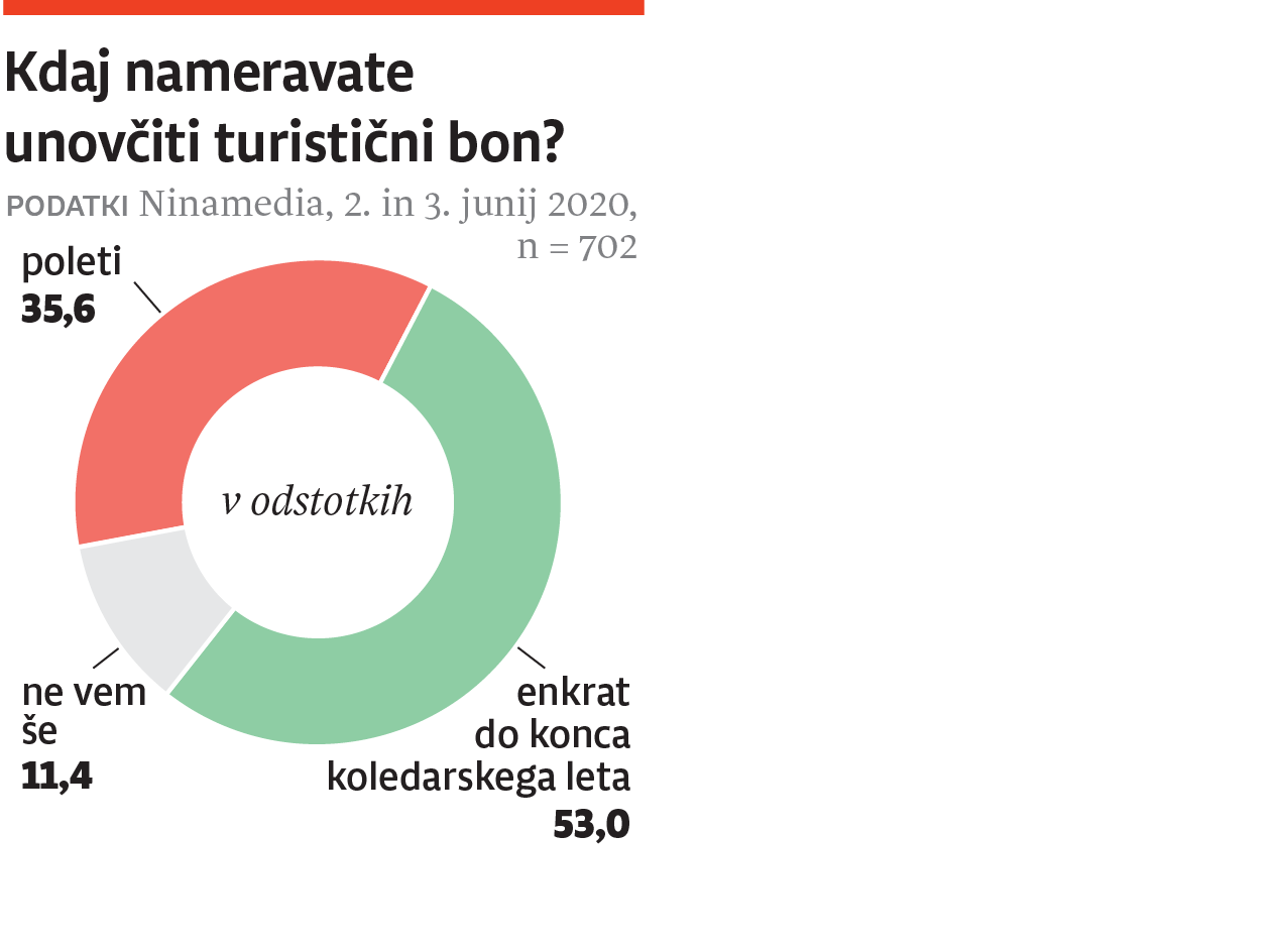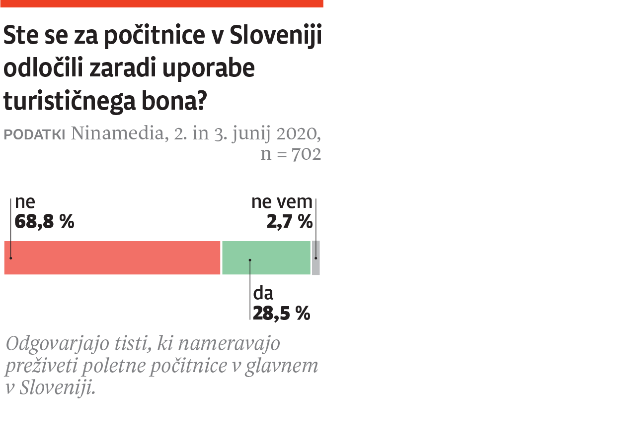 Zaradi epidemije novega koronavirusa je turizem povsem obstal. V pogon naj bi ga pomagali spraviti turistični boni oziroma vavčerji, ki nam jih bo država namenila za prenočevanje z zajtrkom pri izbranem ponudniku tovrstnih storitev. Raziskovalna agencija Ninamedia je po naročilu Dnevnika preverila, kolikšna je podpora temu vladnemu ukrepu. Rezultati kažejo, da bone podpira skoraj 72 odstotkov vprašanih, tri četrtine podpornikov jih namerava tudi izkoristiti, vendar delež tistih, ki jih podpirajo in jih bodo izkoristili, s starostjo pada. Najbolj so jim naklonjeni mladi do 30 let. Blizu 70 odstotkov državljank in državljanov, starejših od 60 let, bone sicer podpira, vendar jih je le slaba polovica odgovorila, da jih bodo tudi porabili.