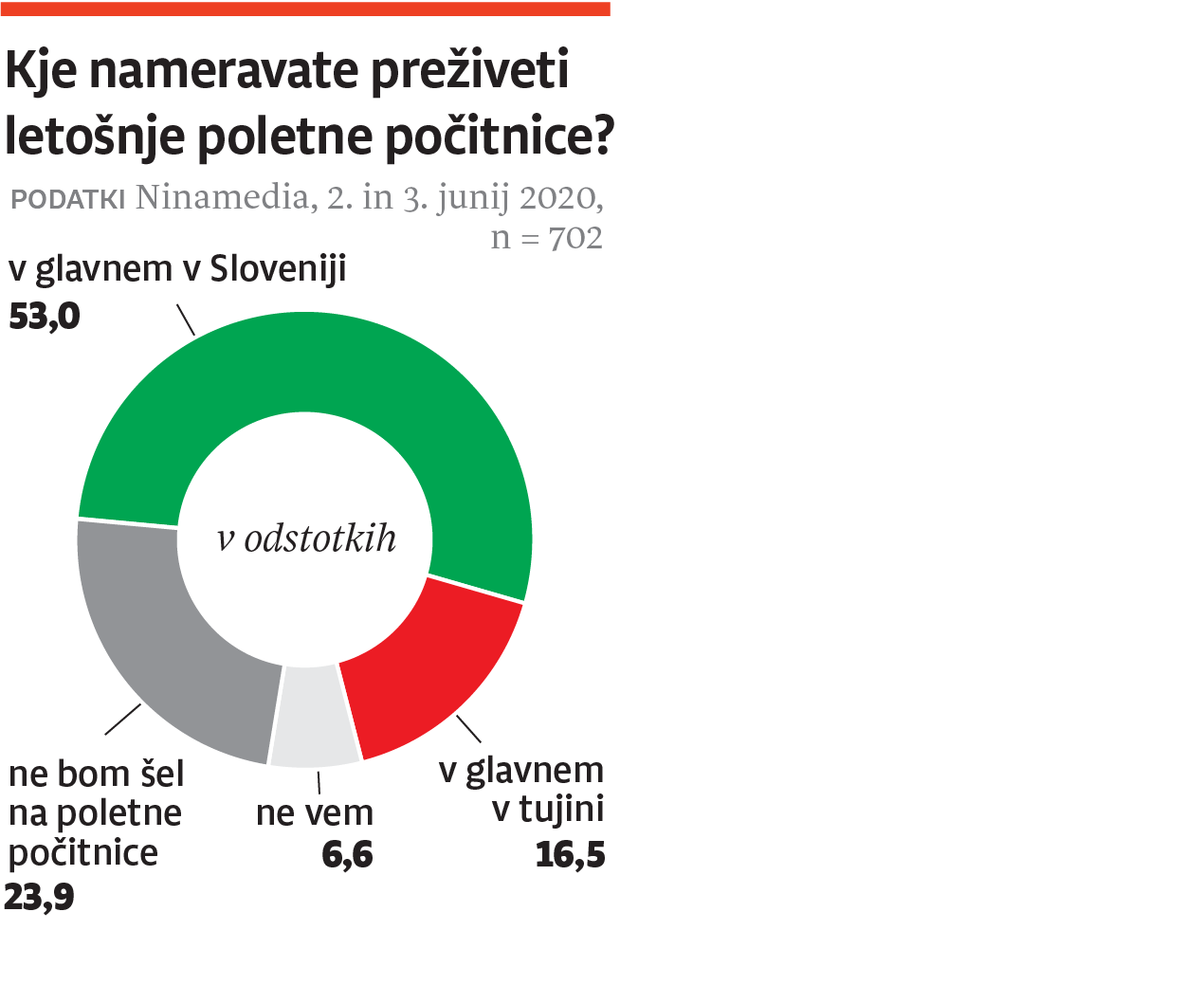 Lani se je vsaj enega zasebnega potovanja udeležilo okoli 66 odstotkov prebivalcev Slovenije, starih 15 let ali več. To pomeni, da si jih tretjina počitnic ni privoščila. Po podatkih Sursa je bilo lani skoraj dve tretjini vseh zasebnih potovanj opravljenih v tujini. Letos bo, kot kaže naša raziskava, to razmerje obrnjeno. Dobra polovica (nekoliko več moških kot žensk) vseh vprašanih namerava poletne počitnice preživeti v glavnem v Sloveniji in le 16,5 odstotka v glavnem v tujini, četrtina nikjer. Na to razmerje seveda vpliva epidemija koronavirusa, ki možnost potovanj trenutno močno omejuje. Da bodo počitnikovali v glavnem v domovini, sta napovedali kar dve tretjini mlajših od trideset let, čez mejo pa se namerava na poletni dopust odpraviti zgolj dobrih sedem odstotkov starejših od šestdeset let. Skoraj tretjina anketirancev te starosti ne bo šla nikamor na poletne počitnice, med tistimi z osnovnošolsko izobrazbo je takšnih slaba polovica, med ljudmi iz ruralnega okolja pa dobra četrtina.