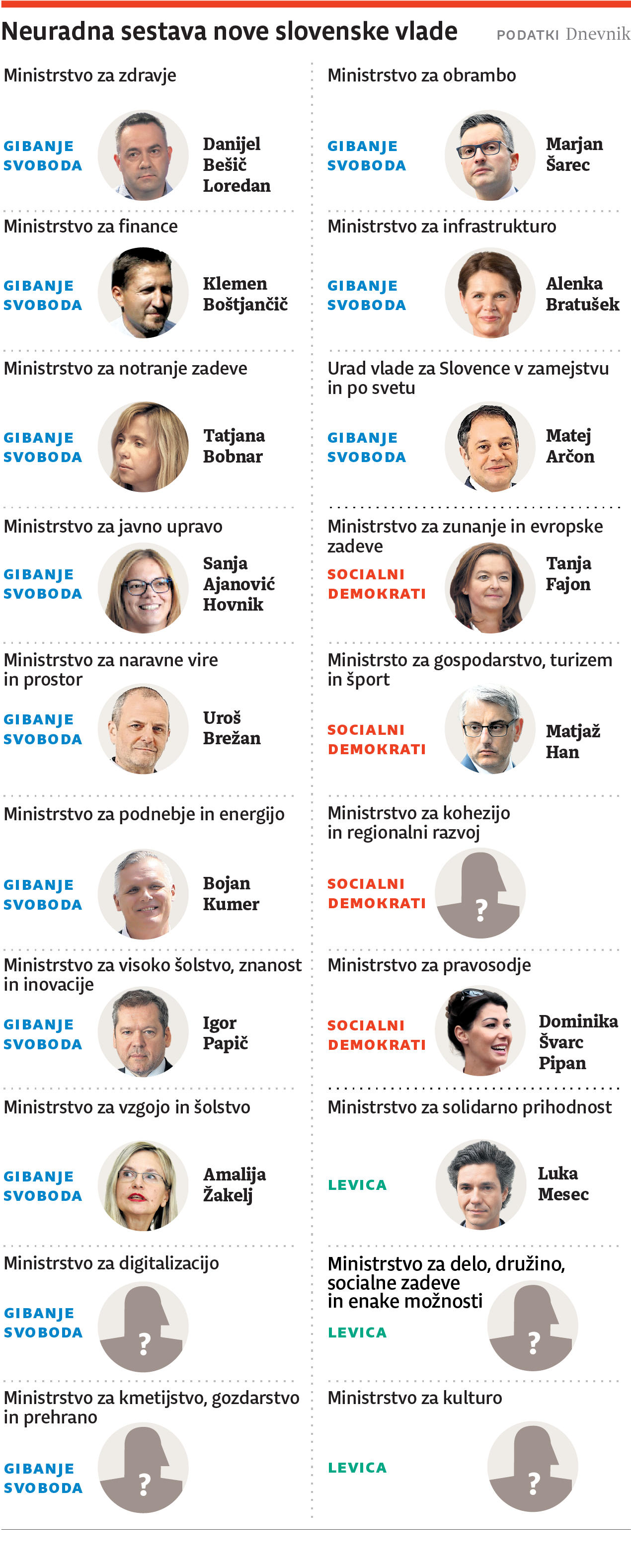 Tako imenovana državotvorna ministrstva so si v Gibanju Svoboda razdelili s Socialnimi demokrati. Tanja Fajon bo ministrica za zunanje in evropske zadeve, obrambni minister bo Marjan Šarec (LMŠ), ministrica za notranje zadeve pa bo nekdanja generalna direktorica policije Tatjana Bobnar. Ključni minister prihodnje vlade bo finančni minister Boštjan Klemenčič, čigar ime je bodoči mandatar skrival do zadnjega. Med novimi imeni je tudi ministrica za vzgojo in šolstvo Amalija Žakelj, ministrica za pravosodje pa bo socialna demokratka Dominika Švarc Pipan, čeprav se je zaradi nje v SD vnel dokaj oster spor. Koalicijski partnerji niso predstavili vseh ministrskih kandidatov s pojasnilom, da je v naboru še nekaj imen, o katerih morajo dodatno premisliti ali pa opraviti razpravo na organih strank. Gibanje Svoboda mora predstaviti še ministra za digitalizacijo in ministra za kmetijstvo, SD ministra za kohezijo in regionalni razvoj, Levica pa ministra za kulturo ter ministra za delo, družino, socialne zadeve in enake možnosti. Golob pričakuje, da bodo vsa imena ministrskih kandidatov znana prihodnji teden.