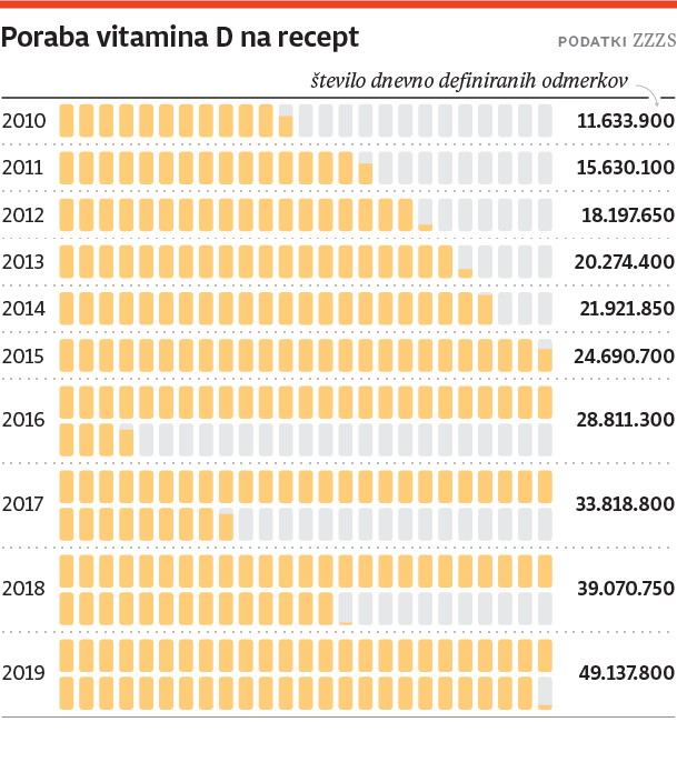 Iz podatkov Zavoda za zdravstveno zavarovanje Slovenije (ZZZS) je razvidno, da je predpisovanje vitamina D v zadnjem desetletju stalno naraščalo. Pacienti so bili leta 2010 deležni 11,6 milijona odmerkov, lani so jih zdravniki predpisali že 49,1 milijona. Na recept lahko ta vitamin poleg otrok za zdaj med drugimi prejemajo ljudje z osteopenijo in osteoporozo, kronično ledvično boleznijo, z motnjami, ki povzročajo pomanjkanje vitamina D, pri dolgotrajnem zdravljenju s sistemskimi glukokortikoidi in ob zdravljenju kostnih zasevkov. Ali bo v luči nedavnih priporočil skupine štirih strokovnjakov vitamin D na recept prejemalo še več prebivalcev Slovenije, pa še ni znano. Na ZZZS menijo, da bi se moralo do teh priporočil opredeliti ministrstvo za zdravje s svetovalno skupino za covid-19. Tudi pri sedanjih omejitvah predpisovanja so sicer možne izjeme, so nam pojasnili na zdravstveni blagajni, a morajo biti dobro utemeljene.