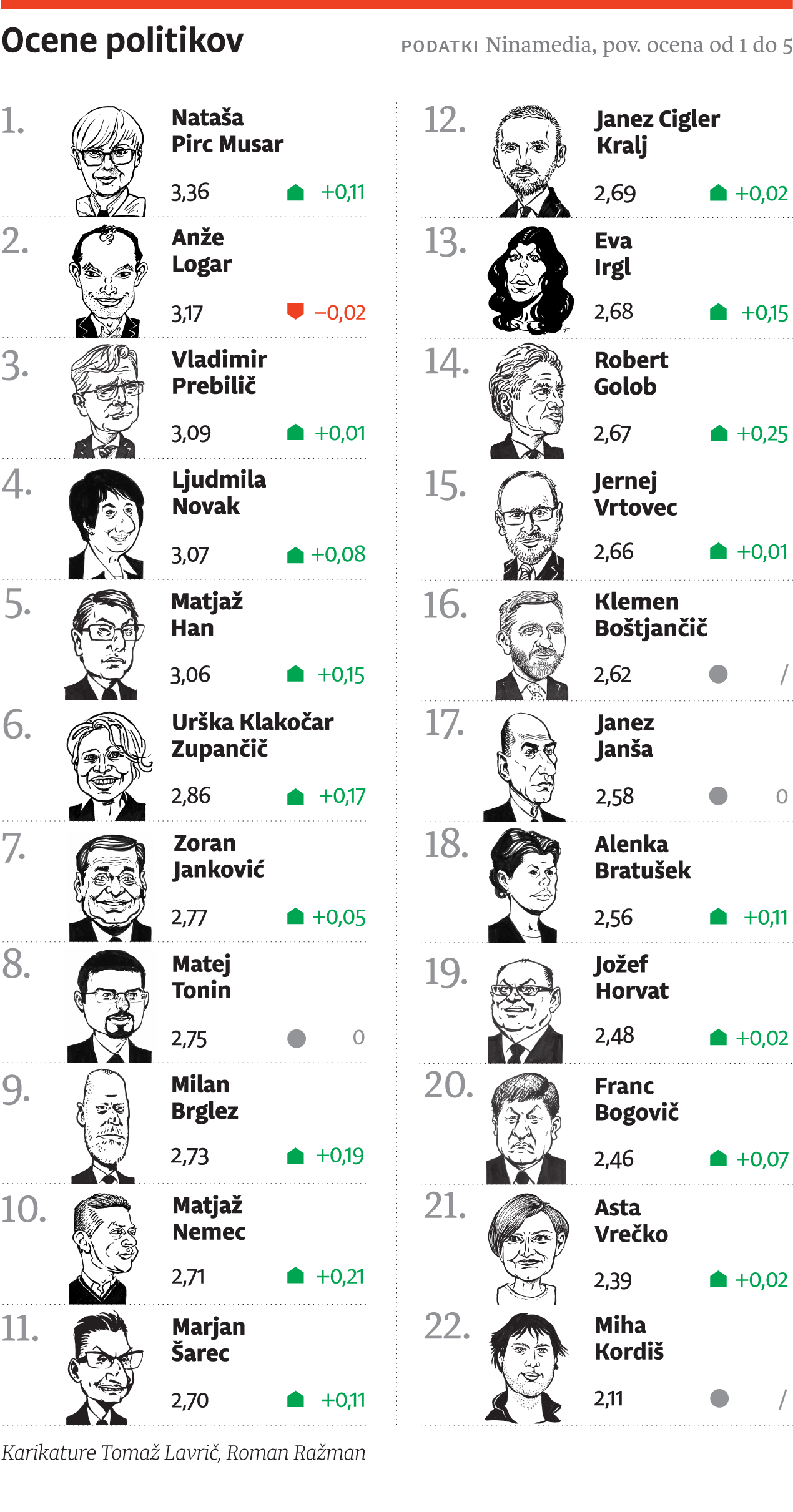 Na prvih petih mestih so ista imena kot prejšnjič. Za prvouvrščeno Natašo Pirc Musar, tokrat z opazno višjo oceno kot prejšnjikrat, je na drugem mestu Anže Logar, edini ocenjen slabše kot minuli mesec. Sledijo Vladimir Prebilič, Ljudmila Novak in Matjaž Han. Za dve mesti navzgor, na šesto mesto, se je povzpela Urška Klakočar Zupančič. Zoran Janković ostaja na sedmem mestu, dve mesti navzdol, na osmo mesto, pa se je tokrat uvrstil Matej Tonin. Čeprav je dobil natanko enako oceno kot minuli mesec (2,75), se je glede na to, da je večina preostalih politikov na lestvici svojo oceno izboljšala, Tonin uvrstil nižje na lestvici kot prejšnjikrat. Deveti, Milan Brglez, je v primerjavi s prejšnjim mesecem pridobil štiri mesta, deseti, Matjaž Nemec, pa je pet mest višje.