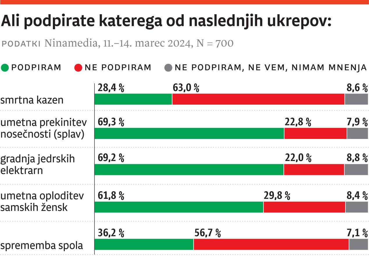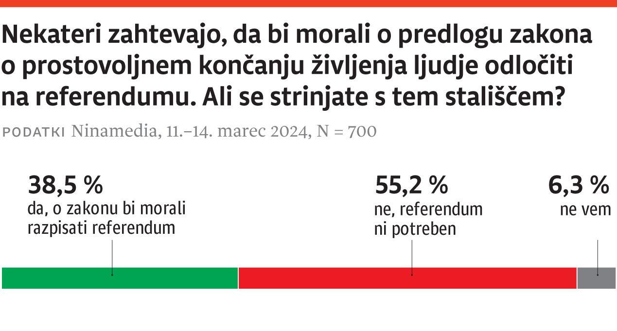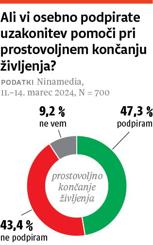 Sodeč po rezultatih Dnevnikove javnomnenjske ankete Vox populi je slovenska javnost močno razdvojena glede uzakonitve pomoči pri prostovoljnem končanju življenja: 47-odstotni delež vprašanih je temu projektu naklonjen, 43 odstotkov anketiranih pa je povedalo, da uzakonitve pomoči pri prostovoljnem končanju življenja ne podpira. Presenetljivo 55-odstotna večina prebivalcev Slovenije meni, da (posvetovalni) referendum o tem vprašanju ni potreben.