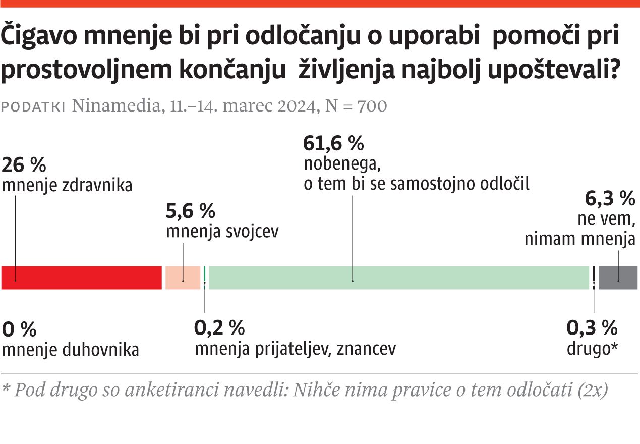 Vprašanje, ali bi bilo primerno, da bi uzakonili pravico do pomoči pri prostovoljnem končanju življenja, torej močno deli slovensko družbo, kar je potrdila tudi naša tokratna javnomnenjska anketa. Nekatera stanovska združenja uzakonitvi te pravice javno nasprotujejo. Anketirance smo zato vprašali, čigavo mnenje bi najbolj upoštevali, če bi se odločali o tem, da bi to pravico uporabili in prostovoljno končali svoje življenje.