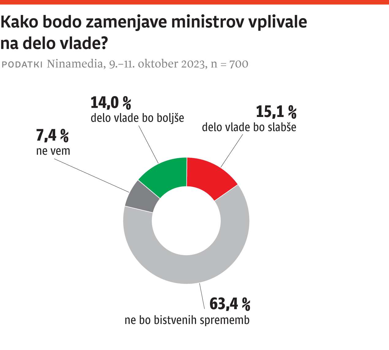 Pa bo kaj koristi od menjave ministrov? Sodelujoči v anketi so precej skeptični. Da pričakujejo, da bo zaradi zamenjav ministrov delo vlade boljše, jih je odgovorilo 14 odstotkov, da bo delo vlade slabše, 15,1 odstotka, skoraj dve tretjini, 63,4 odstotka, pa jih je menilo, da zamenjave ministrov pri delu vlade ne bodo prinesle bistvenih sprememb. Križanje odgovorov pokaže, da so pri tem vprašanju najbolj skeptični volilci SDS, med katerimi jih kar 75 odstotkov ne pričakuje bistvenih sprememb. Najbolj optimistični so seveda volilci GS, ki nadpovprečno pogosto pričakujejo, da bo po zamenjavah ministrov delo vlade boljše, takih je 24 odstotkov, medtem ko je med volilci SDS takih le pet odstotkov. Najbolj pesimistični so volilci Levice, od katerih jih 21 odstotkov pričakuje, da bo delo vlade slabše. S tem so prehiteli celo volilce SDS, kjer je takih 18 odstotkov, v nasprotju z volilci GS, med katerimi je takih pet odstotkov.