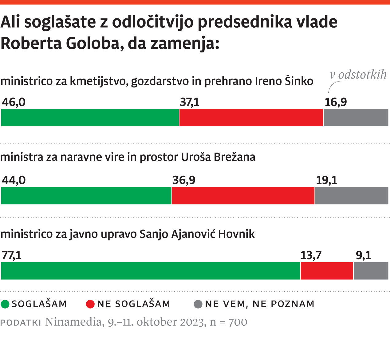 Odločitev predsednika vlade Roberta Goloba, da v svoji vladi zamenja tri ministre, je eno od najbolj odmevnih dogajanj zadnje čase na slovenskem političnem prizorišču. Tudi o tem so v oktobrski javnomnenjski anketi Vox populi, ki jo za Dnevnik izvaja Ninamedia, spraševali sodelujoče v anketi. Vprašali so jih, ali soglašajo s premierjevo odločitvijo o zamenjavi, za vsakega posebej: za ministrico za kmetijstvo, gozdarstvo in prehrano Ireno Šinko, za ministra za naravne vire in prostor Uroša Brežana in za ministrico za javno upravo Sanjo Ajanović Hovnik. Pokazalo se je, da medtem ko o odstavitvi prvih dveh v javnosti še obstaja nekaj dvoma, ima odstavitev Ajanović-Hovnikove nedvomno široko podporo.