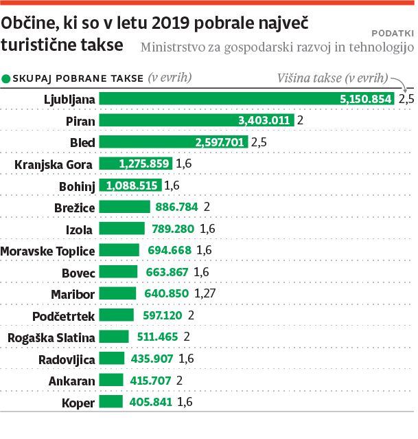 Ponudniki prenočitvenih zmogljivosti v 178 občinah so lani pobrali 24,8 milijona evrov turistične takse, v 34 občinah pa niti centa. Kar petino vse turistične takse je pobrala Ljubljana. Razloga za to sta bila dva: odlična zasedenost prenočitvenih zmogljivosti in dejstvo, da v prestolnici za prenočevanje zaračunavajo najvišjo možno turistično takso, to je 2,5 evra na gosta na noč. Enak znesek pobirajo tudi v Piranu in Kidričevem, vse druge občine pa so se odločile za nižjo takso; v petnajstih znaša dva evra, v štirinajstih manj kot evro (najnižjo turistično takso, 0,48 evra, imajo v Preboldu), v vseh drugih pa med enim in dvema evroma.
