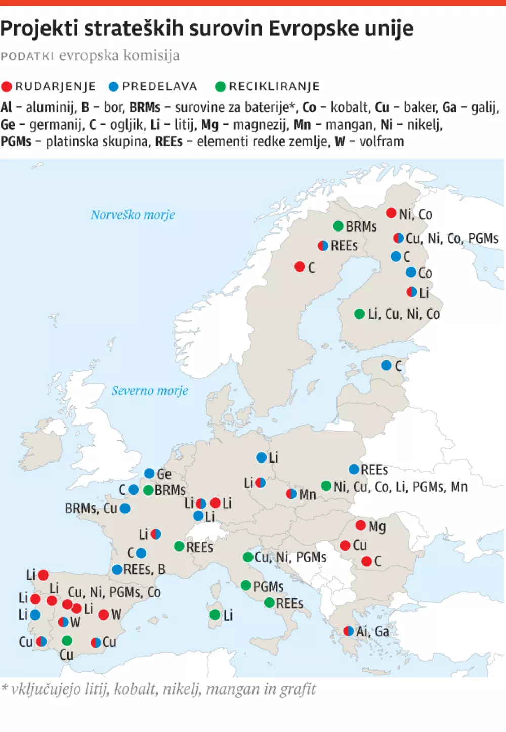 Evropska unija ob vse večjih geopolitičnih napetostih in negotovih gospodarskih razmerah poskuša stopiti na pot odpravljanja velike odvisnosti od proizvajalcev redkih surovin in elementov redke zemlje iz tretjih držav. Predvsem je očitna želja po zmanjšanju odvisnosti od Kitajske. Načrti za več rudarjenja, predelave in recikliranja strateških surovin na evropskih tleh so usmerjeni k samozadostnosti dobavnih verig v primeru kriz in nestabilnosti. V ta namen je evropska komisija sprejela poseben seznam 47 prednostnih projektov. Njihov skupni cilj je, da EU do leta 2030 deset odstotkov svojih potreb po strateških surovinah zadovolji z rudarjenjem na evropskih tleh, 40 odstotkov vseh snovi predela na območju EU in opravi 25 odstotkov reciklaže teh materialov. Največ projektov je namenjenih litiju. Redki strateški elementi, kot so redke zemlje, brez katerih ni zelenega prehoda, pa so v manjšini.