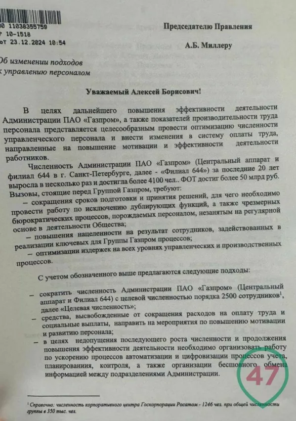 Ruski portali so danes objavili pismo, ki ga je predsedniku uprave Gazproma Aleksiju Millerju napisala njegova namestnica Jelena Iljuhina, pristnost dokumenta pa je medijem potrdil drugi Millerjev namestnik Sergej Kuprijanov. V pismu je tako Iljuhina napisala, da »izzivi, ki so pred Gazpromom«, terjajo »krajše roke odločanja«, to pa z drugimi besedami pomeni, da je v podjetju preveč zaposlenih, ker da se menda funkcije »podvajajo« in zavirajo »birokratske procese«. Zato bodo te prečistili tako, da bodo »osrednji aparat« podjetja, torej osrednjo administracijo, skrčili s sedanjih 4100 na 2500 zaposlenih, kar pomeni, da bodo 1600 ljudi odpustili.