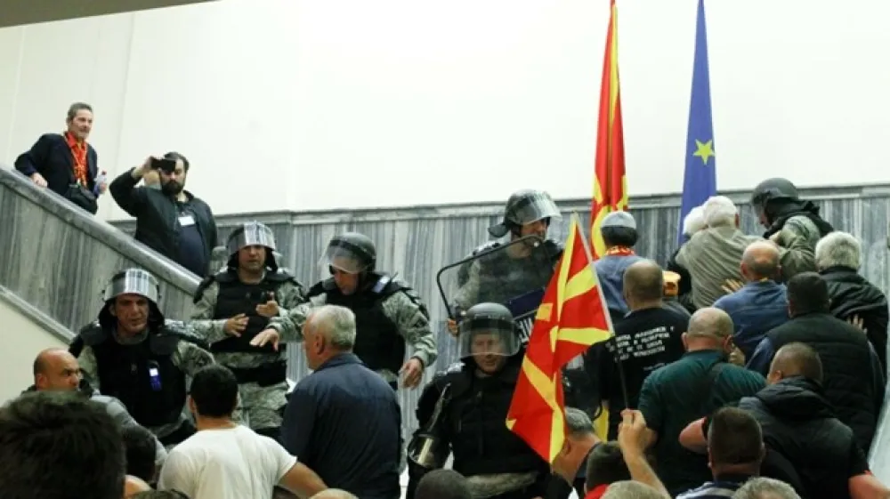 Nato so protestniki vdrli v zgradbo parlamenta, vendar pa so jim varnostne službe preprečile vstop v glavno dvorano. V pretepu med protestniki in podporniki Zaeva je bilo poškodovanih več ljudi, najmanj osem pa so jih morali prepeljati v bolnišnico, je poročala makedonska televizija Telma. Med drugim sta bila poškodovan tudi Zaev in vodja Zavezništva za Albance Zijadin Sela, ki je utrpel hujše poškodbe, poročanje televizije povzema avstrijska tiskovna agencija APA.