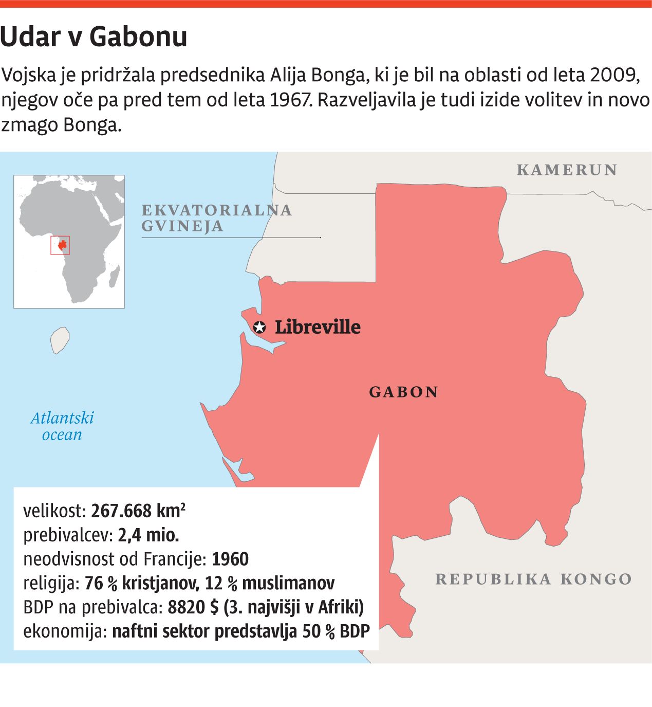 V sredo ponoči je v 2,4-milijonskem Gabonu volilna komisija razglasila dosedanjega avtoritarnega predsednika Alija Bonga za zmagovalca sobotnih predsedniških volitev, na katerih pa so se dogajale čudne in nesprejemljive stvari, med drugim tuji opazovalci in tuji novinarji niso dobili vizumov. A kmalu zatem se je zgodaj zjutraj na javni televiziji pojavilo dvanajst oficirjev predsedniške garde, redne vojske in policije, ki so razveljavili volitve, odpravili oblastne institucije in sporočili: »Da bi preprečili nadaljnje vladanje neodgovornih in nepredvidljivih oblasti, kar se kaže v slabšanju družbene kohezije in vse večjem kaosu v državi, smo se odločili končati sedanji režim.« Povedali so tudi, da je 64-letni predsednik Bongo v hišnem priporu (od koder mu je pozneje uspelo po spletu pozvati »prijatelje po svetu«, naj mu pomagajo) ter da sta aretirana eden od njegovih sinov in predsednik volilne komisije. Spet je začel delovati splet, ki ga je vlada v soboto, tako kot francoske televizijske kanale, izklopila z utemeljitvijo, da bi lahko prišlo do nasilja v dnevih po volitvah. V soboto je Bongova vlada uvedla tudi policijsko uro, ki se torej ni začela z včerajšnjim pučem.