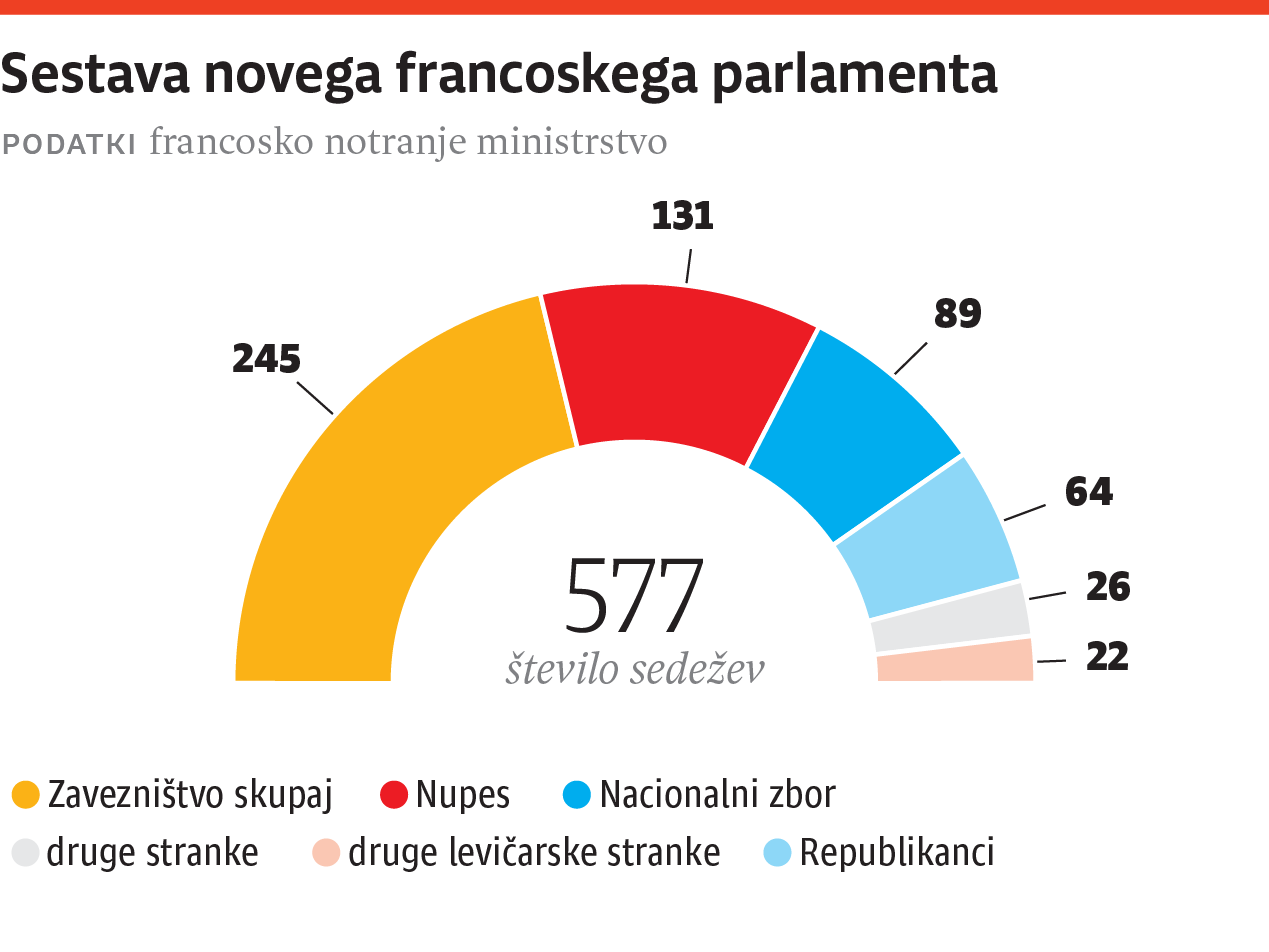 »Potres« (Les Echos), »Klofuta za Macrona« (L'Opinion), »Klofuta« (La Libération), »Razpad Francije« (La Croix), »Francija na preizkušnji brezvladja« (Le Figaro), »Macron žrtev glasovanja proti sebi« (Le Monde), to so ponedeljkovi naslovi na prvih straneh francoskih časopisov. Francija se je po nedeljskem drugem krogu parlamentarnih volitev znašla brez jasne vladne večine. Nekateri celo menijo, da v tako razpršenem parlamentu, kot je zdaj in s kakršnim noben predsednik v zadnjih 27 letih ni začel svojega mandata, ne bo mogoče vladati in sprejemati zakonov.