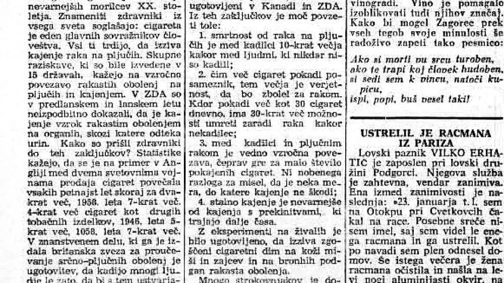 V članku o kajenju in o pljučnem raku piše vodja statističnega oddelka instituta za raziskavo medicinskega sveta londonske univerze dr. Doll prepričljivo o tem, da je cigareta eden od glavnih sovražnikov človekovega zdravja. Dr. Doll navaja skoraj istovetne zaključke o raziskovanju raka, kot so bili ugotovljeni v Kanadi in ZDA. Iz teh zaključkov je moč povzeti tole: