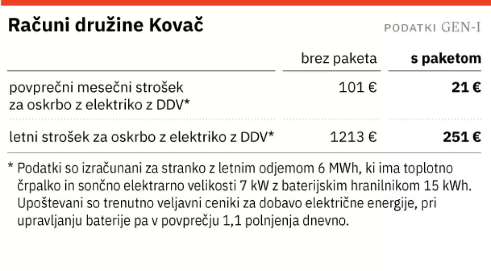 Družina Kovač živi v nizkoenergijski hiši in letno porabi približno 6.000 kWh elektrike, pri čemer za ogrevanje uporabljajo toplotno črpalko. Pred odločitvijo za paket Pametna samooskrba so za elektriko plačevali 1.213 € na leto. Danes, zahvaljujoč lastni sončni elektrarni in naprednemu upravljanju baterijskega hranilnika, znaša njihov letni strošek le še 251 € – to pomeni kar 962 € letnega prihranka oziroma 79 % nižji strošek za elektriko.