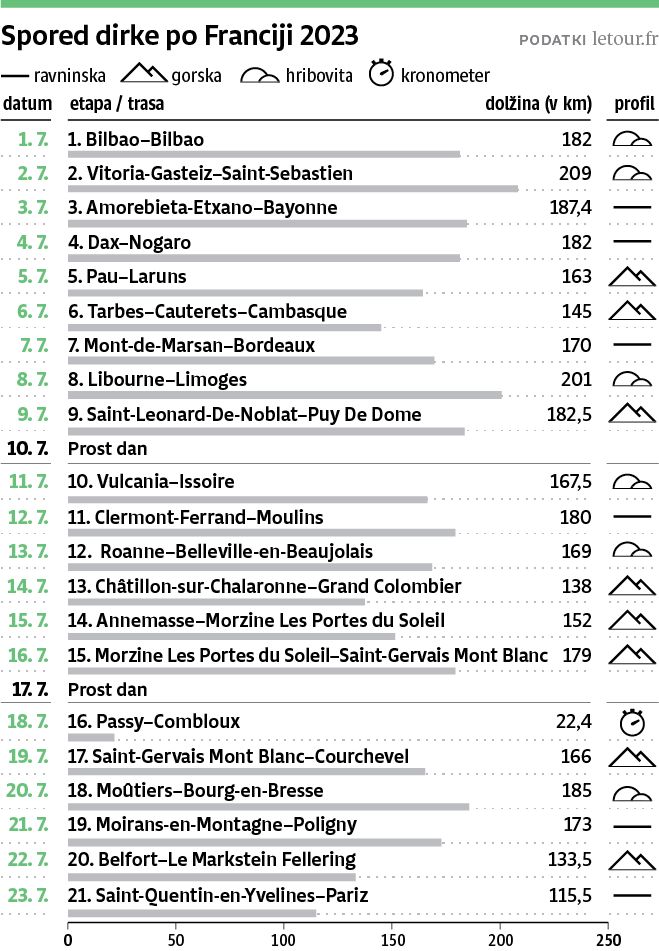 Ob razkritju etap letošnje dirke po Franciji konec oktobra lani smo v Dnevniku zapisali, da je letošnji Tour primeren za gorske koze. 3405,6 kilometra kolesarje vodi čez pet francoskih gorskih verig. Po uvodu v Baskiji se bodo kolesarji podali proti Pirenejem, sledijo Centralni masiv, gorovje Jura, spektakel v Alpah in za konec še Vogezi. Na trasi bo kar 30 vzponov ekstra, prve in druge kategorije, kar je največ v zadnjih letih, skupno pa bodo tekmovalci prevozili kar 56.400 višinskih metrov. Vse je enakomerno razporejeno skozi tri tedne, a vrhunec vseeno sledi v zadnjem tednu, ko bo v Alpah na sporedu kraljevska 17. etapa s ciljem v Courchevelu, še pred tem pa čaka kolesarje obisk najvišje točke Toura Col de la Loze (2304 m).