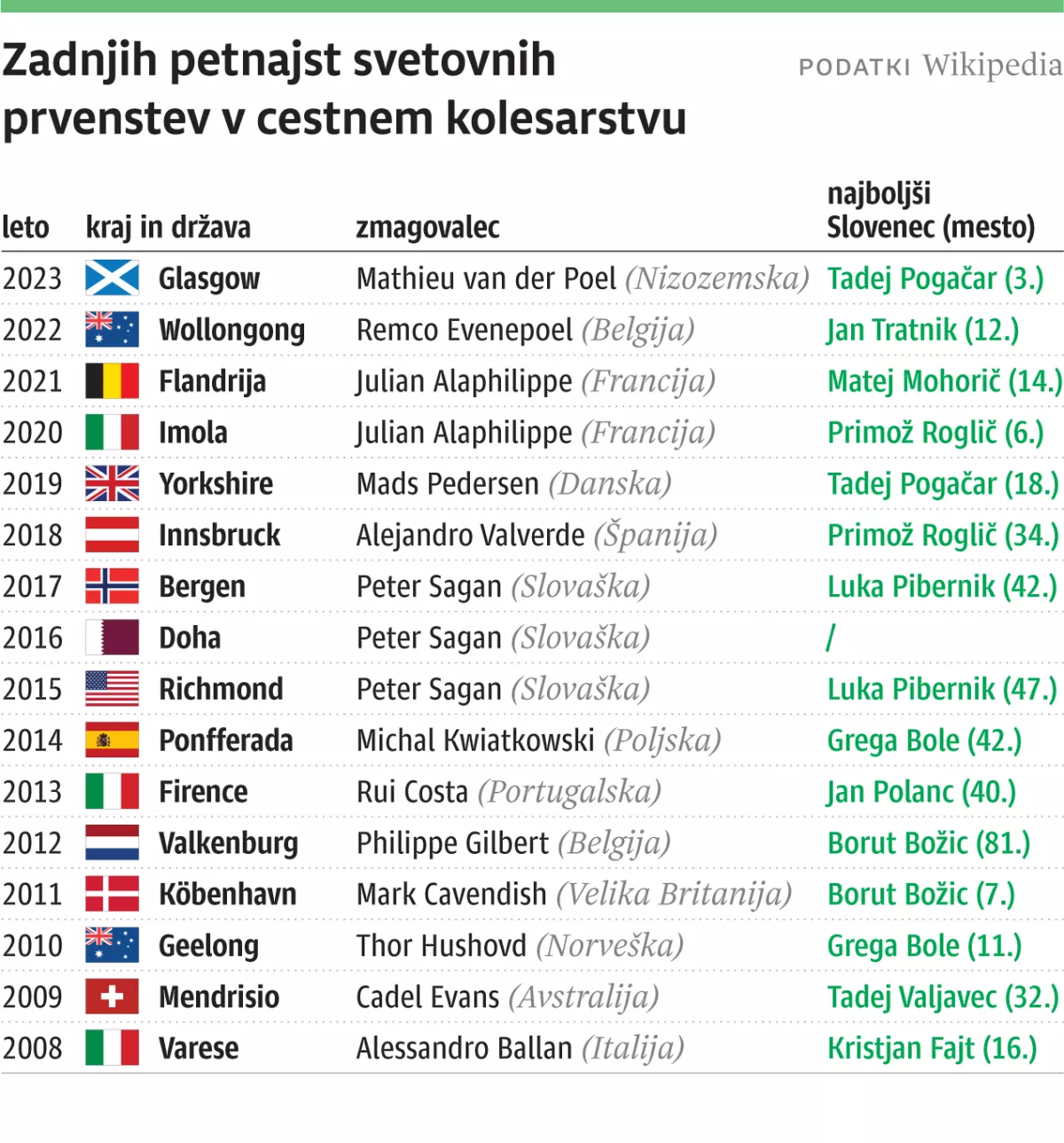 Freire, Binda in Steenbergen imajo ob treh naslovih še po eno bronasto odličje, a za največji podvig med vsemi je poskrbel Peter Sagan, ki je mavrično majico slavil kar tri leta zaporedoma. Svetovni prvak je postal v Richmondu 2015, Dohi 2016 in Bergnu 2017. »Zmaga ne spremeni ničesar, a je zagotovo nekaj posebnega. Zagotovim lahko le to, da so občutki izjemni,« je zgodovinski uspeh na Norveškem pred sedmimi leti doživel Peter Sagan.