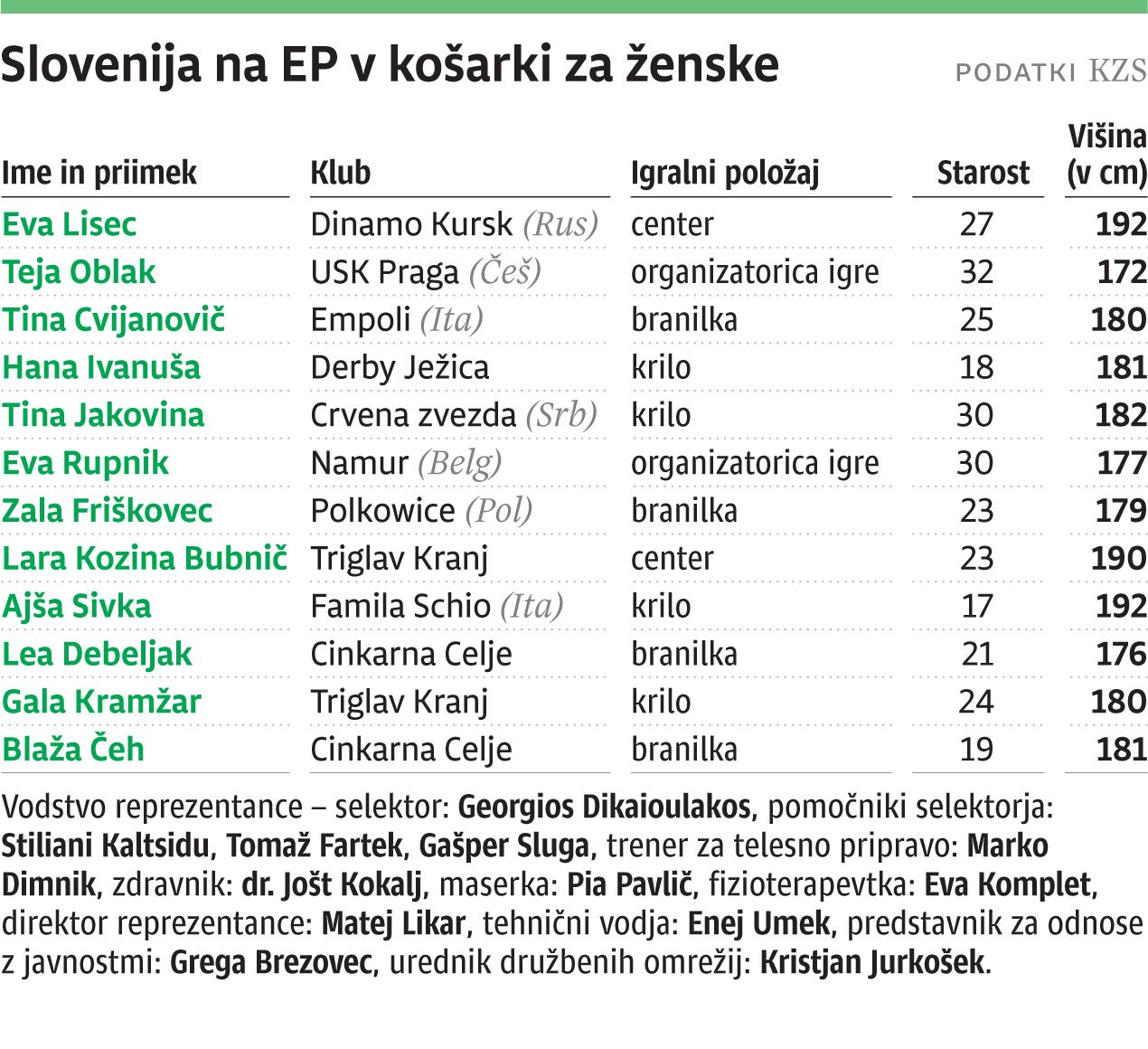 Po pripravah, ki so jih začele in končale v Ljubljani, vmes vadile še v Zrečah, Podčetrtku in Mariboru, je slovenski selektor Georgios Dikaioulakos seznam igralk za EP skrajšal na dvanajst imen. Od njegovih 16 izbrank sta morali zaradi poškodb priprave reprezentance z vzdevkom »Rakete« predčasno zapustiti 24-letna organizatorica igre Aleksandra Krošelj (Castors Braine, Belgija) in 20-letni krilni center Mojca Jelenc (Cinkarna Celje), tik pred začetkom Eura pa je Grk kot »tehnološki višek« črtal še 19-letno krilno igralko Zalo Šrot (San Salvatore, Italija) in 27-letno branilko Saro Vujačić (Vicenza, Italija). Povprečna starost dvanajstih igralk je zdaj dobrih 24 let, povprečna višina skoraj 182 centimetrov.