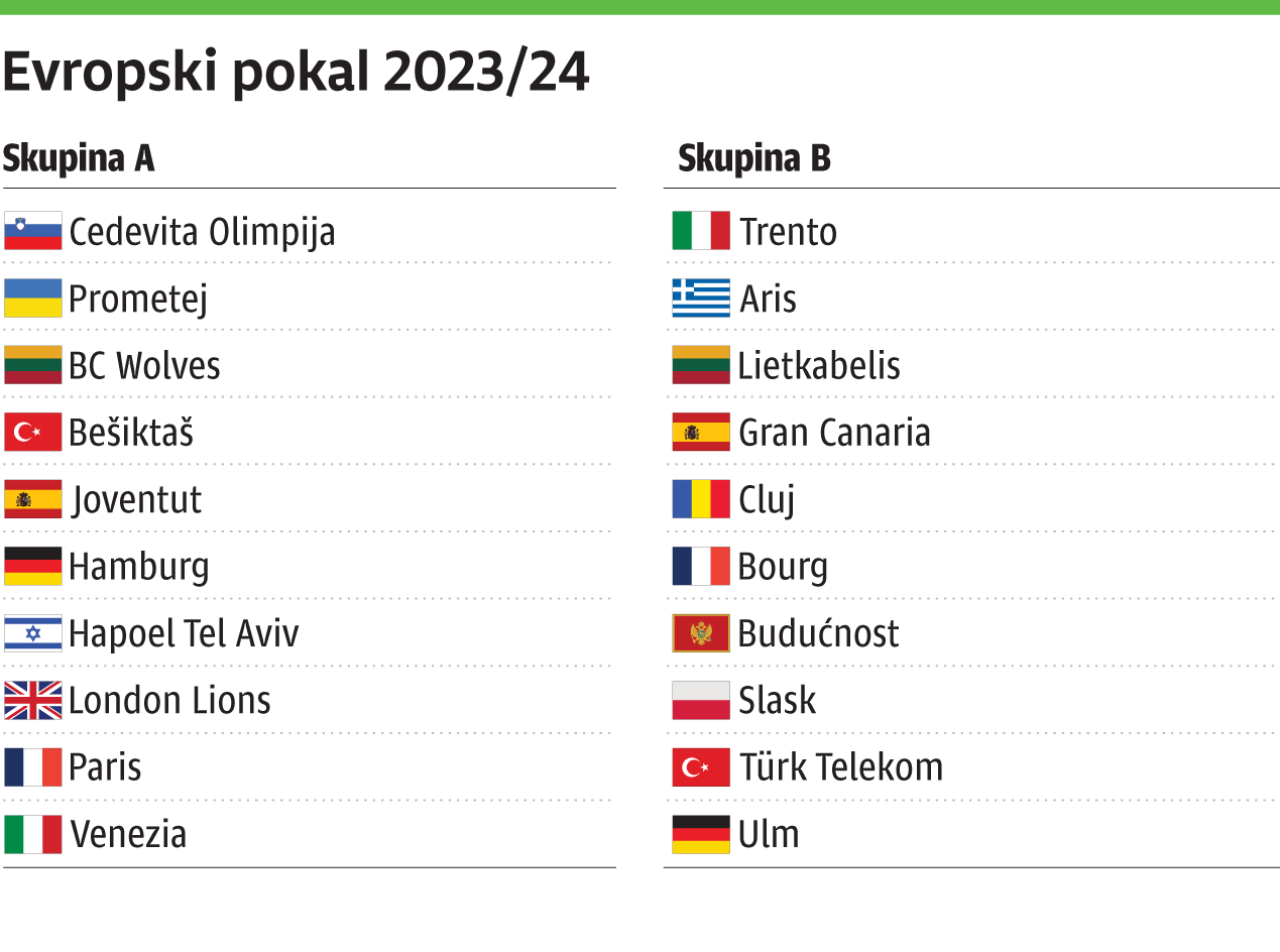 Evropski pokal, skupina A, 1. krog, danes ob 19. uri: Hapoel – Olimpija, ob 20.30: Paris – BC Wolves, jutri ob 18. uri: Prometej – Hamburg, ob 20.15: Joventut – Bešiktaš, ob 20.30: London Lions – Venezia.