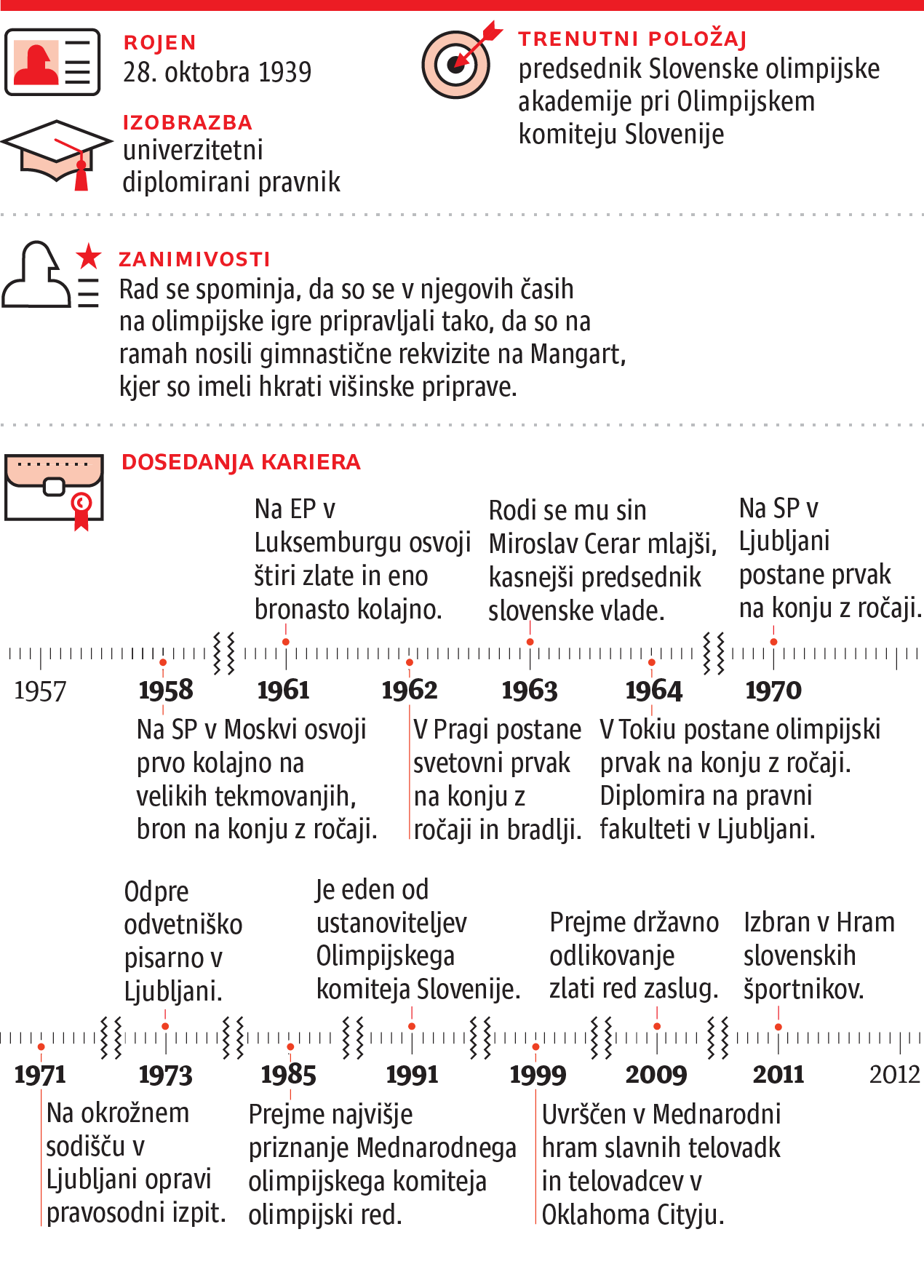 Mira Cerarja je zaznamovala gimnastika. Tako v izjemno uspešnih letih športne poti kot tudi po koncu kariere. Preden se je pri devetih letih pri Telovadnem društvu Ljubljana (zdajšnje Športno društvo Narodni dom) začel resno ukvarjati s telovadbo, je veliko časa preživel pri sorodnikih na Turjaku, saj je bil njegov oče Ivan interniran v taborišče Dachau. Osnovnih gimnastičnih korakov ga je naučil Tomaž Šavnik, do najboljšega telovadca na svetu ga je popeljal Janez Šlibar, mejnike pa je postavljal še z Borisom Gregorko. Cerar je bil izjemno nadarjen telovadec, kar je potrdil pri dvanajstih letih, ko je postal pionirski prvak Ljubljane. Odtlej je šla njegova kariera strmo navzgor. V petdesetih letih prejšnjega stoletja je najprej osvojil jugoslovanski mladinski primat, kasneje pa še članskega, ki ga v mnogoboju ni izpustil do konca športne poti.