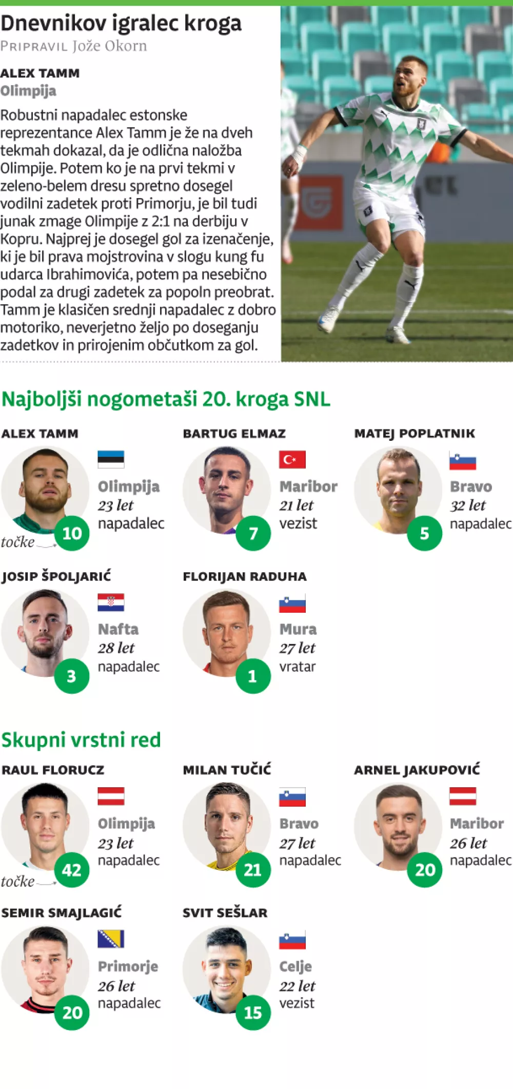 Novi napadalec Alex Tamm je zadetek v polno, saj ima po dveh tekmah dva gola in asistenco. Najboljši igralec in strelec lige Raul Florucz (9 golov in 5 asistenc) je zdržal dobro strelsko formo (2 gola spomladi). Največji napredek je pokazal krilni napadalec Marko Brest, ki je spomladi vpisal že štiri asistence. Olimpija samozavestno pričakuje prvo tekmo šestnajstine finala konferenčne lige v četrtek ob 21. uri z Borcem v Banjaluki, kjer bo Ljubljančane podpiralo 1000 navijačev. Borac je na prvi uradni tekmi spomladi v pokalu premagal drugoligaša Čelik iz Zenice s 3:0 in preložil nedeljsko gostovanje pri Sarajevu, do bo spočit za povratno tekmo 20. februarja ob 18.45 v Stožicah.