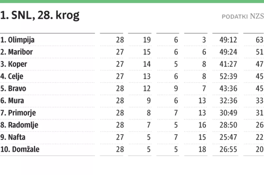 Po 28. krogu prve slovenske lige je Olimpija, ki je rutinsko zmagala na gostovanju v vetrovni Ajdovščini, naredila nov korak k naslovu državnega prvaka. Še posebej, ker si je prvi zasledovalec Maribor privoščil nov spodrsljaj s porazom 0:1 na gostovanju pri zadnjeuvrščenih Domžalah. Vijoličasti, ki so zaradi izključitve Grlića od 48. minute igrali z desetimi nogometaši, so bili ob Kamniški Bistrici obupno slabi. Čeprav je bila posest žoge 62:38 za Maribor, je bilo razmerje v strelih 21:8 za Domžale, v okvir gola pa 8:2.