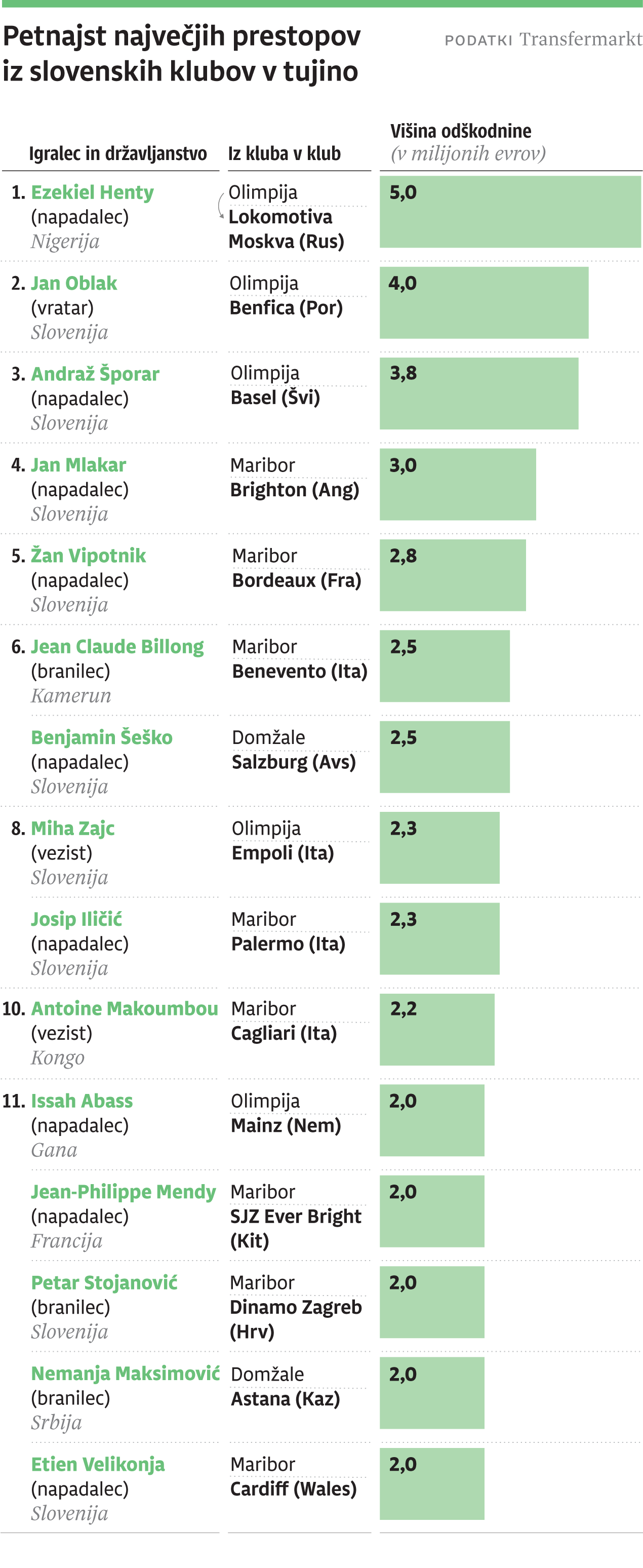 Slovenski rekord glede odškodnine je pet milijonov evrov in ga je postavila postavila Olimpija pod vodstvom predsednika Milana Mandarića in športnega direktorja Ranka Stojića s prodajo Ezekiela Hentyja februarja 2016 v Lokomotivo iz Moskve. V Sloveniji je bilo doslej 15 prestopov, ko je bila odškodnina vsaj dva milijona evrov. V zadnjem času se pogodbe sklepajo s fiksnimi odškodninami in dodatnimi bonusi, ki vrednost lahko zelo povečajo, a so zaviti v tančico skrivnosti, zato je težko določiti končne številke. Glede bonusa se rekordni zaslužek obeta Domžalam za Benjamina Šeška. Ko je leta 2019 kot 16-letni fant iz Domžal odšel v Salzburg, si je klub ob 2,5 milijona evrov odškodnine zagotovil še odstotke ob naslednjem prestopu. Ker je njegov letošnji prestop iz Salzburga v Leipzig vreden 24 milijonov evrov, bodo v domžalsko blagajno kapnili novi milijoni.