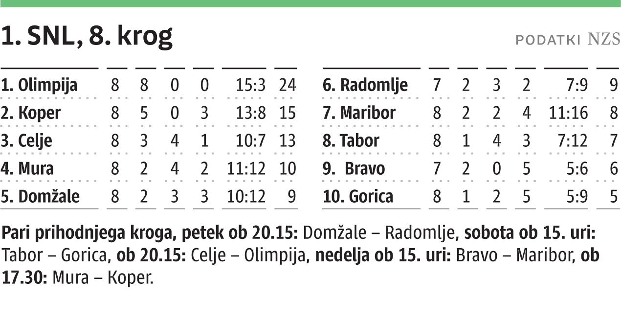 Izidi 8. kroga v 1. SNL: Gorica – Mura 0:0, Koper – Celje 0:2 (0:2, Ikwuemesi 29, Gbamble 40), Maribor – Tabor 2:2 (0:1, Kronaveter 66, Repas 92; Kouao 36, Stanković 62), Olimpija – Domžale 3:2 (0:2, Nukić 53, 67, Rui Pedro 68; Mutavčić 3, Durdov 20), danes ob 17.30: Radomlje – Bravo (v Domžalah).